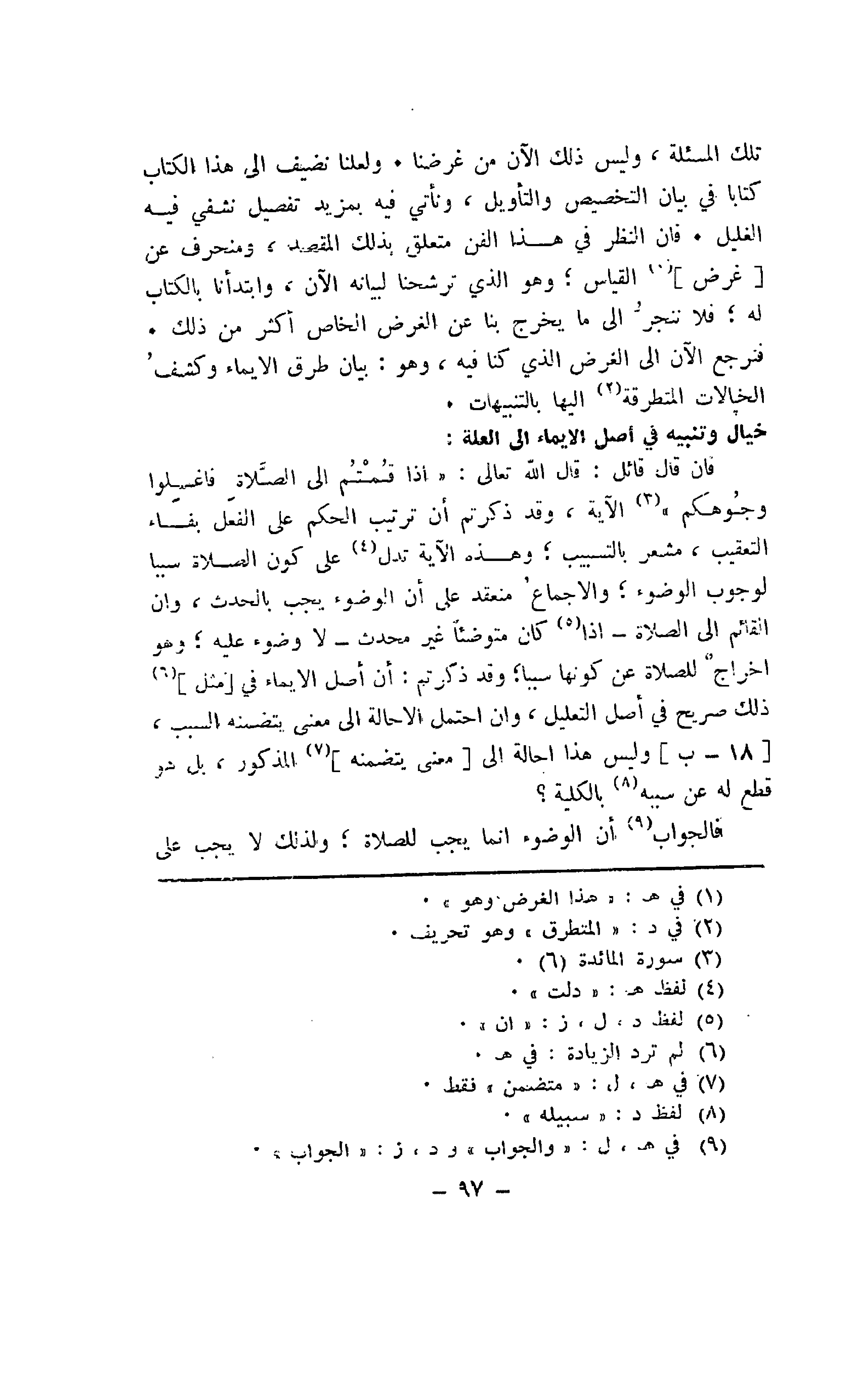 تلك المسئلة، وليس ذلك الآن من غرضنا. ولعلنا نضيف إلى هذا الكتاب كتاباً في بيان التخصيص والتأويل، ونأتي فيه بمزيد تفصيل نشفي فيه الغليل. فإن النظر في هذا الفن متعلق بذلك القصد، ومنحرف عن [غرض] القياس؛ وهو الذي ترشحنا لبيانه الآن، وابتدأنا بالكتاب له؛ فلا ننجر إلى ما يخرج بنا عن الغرض الخاص أكثر من ذلك. فنرجع الآن إلى الغرض الذي كنا فيه، وهو: بيان طرق الإيماء وكشف الخالات المتطرقة إليها بالتنبيهات.