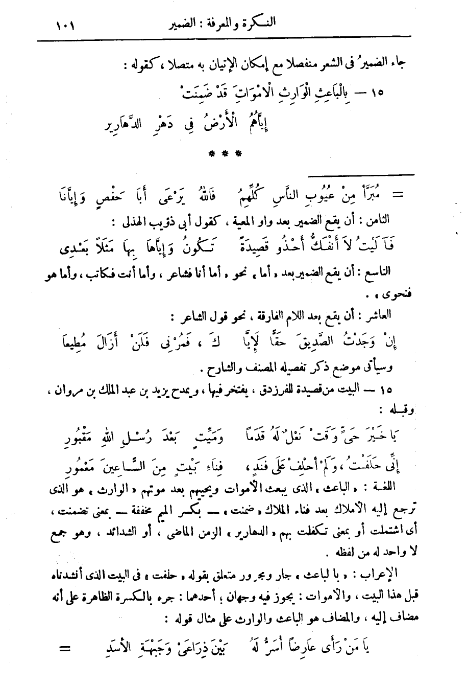 15 - البيت من قصيدة للفرزدق، يفتخر فيها، ويمدح يزيد بن عبد الملك بن مروان، وقبله: يا خير حي وقت نعل له قدما وميت بعد رسل الله مقبور إني حلفت، ولم أحلف على فند، فناء بيت من الساعين معمور اللغة: " الباعث " الذي يبعث الاموات ويحييهم بعد موتهم " الوارث " هو الذي ترجع إليه الاملاك بعد فناء الملاك " ضمنت " - بكسر الميم مخففة - بمعنى تضمنت، أي اشتملت أو بمعنى تكفلت يهم " الدهارير " الزمن الماضي، أو الشدائد، وهو جمع لا واحد له من لفظه.