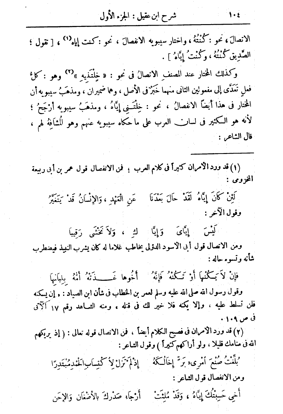 ليس إياي وإياك، ولا نخشى رقيبا ومن الاتصال قول أبي الاسود الدؤلي يخاطب غلاما له كان يشرب النبيذ فيضطرب شأنه وتسوء حاله: فإن لا يكنها أو تكنه فإنه أخوها غذته أمه بلبانها وقول رسول الله صلى عليه وسلم لعمر بن الخطاب في شأن ابن الصياد: " إن يسكنه فلن تسلط عليه، وإلا يكنه فلا خير لك في قتله " ومنه الشاهد رقم 17 الآتي في ص 109.