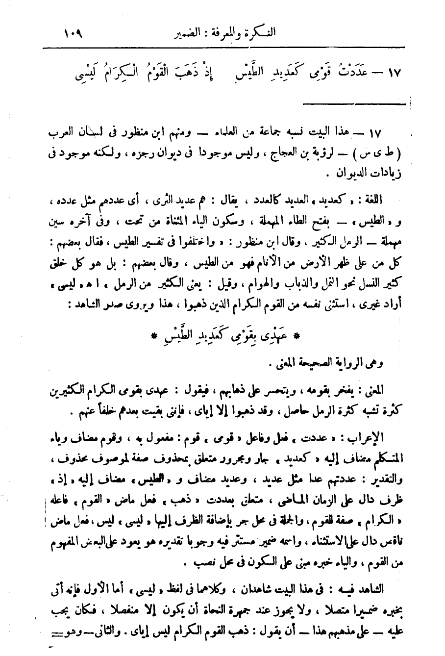 اللغة: " كعديد " العديد كالعدد، يقال: هم عديد الثرى، أي عددهم مثل عدده، و" الطيس " - بفتح الطاء المهملة، وسكون الياء المثناة من تحت، وفي آخره سين مهملة - الرمل الكثير، وقال ابن منظور: " واختلفوا في تفسير الطيس، فقال بعضهم: كل من على ظهر الارض من الانام فهو من الطيس، وقال بعضهم: بل هو كل خلق كثير النسل نحو النمل والذباب والهوام، وقيل: يعني الكثير من الرمل " اه " ليسي " أراد غيري، استثنى نفسه من القوم الكرام الذين ذهبوا، هذا ويروى صدر الشاهد: عهدي بقومي كعديد الطيس وهي الرواية الصحيحة المعنى.
