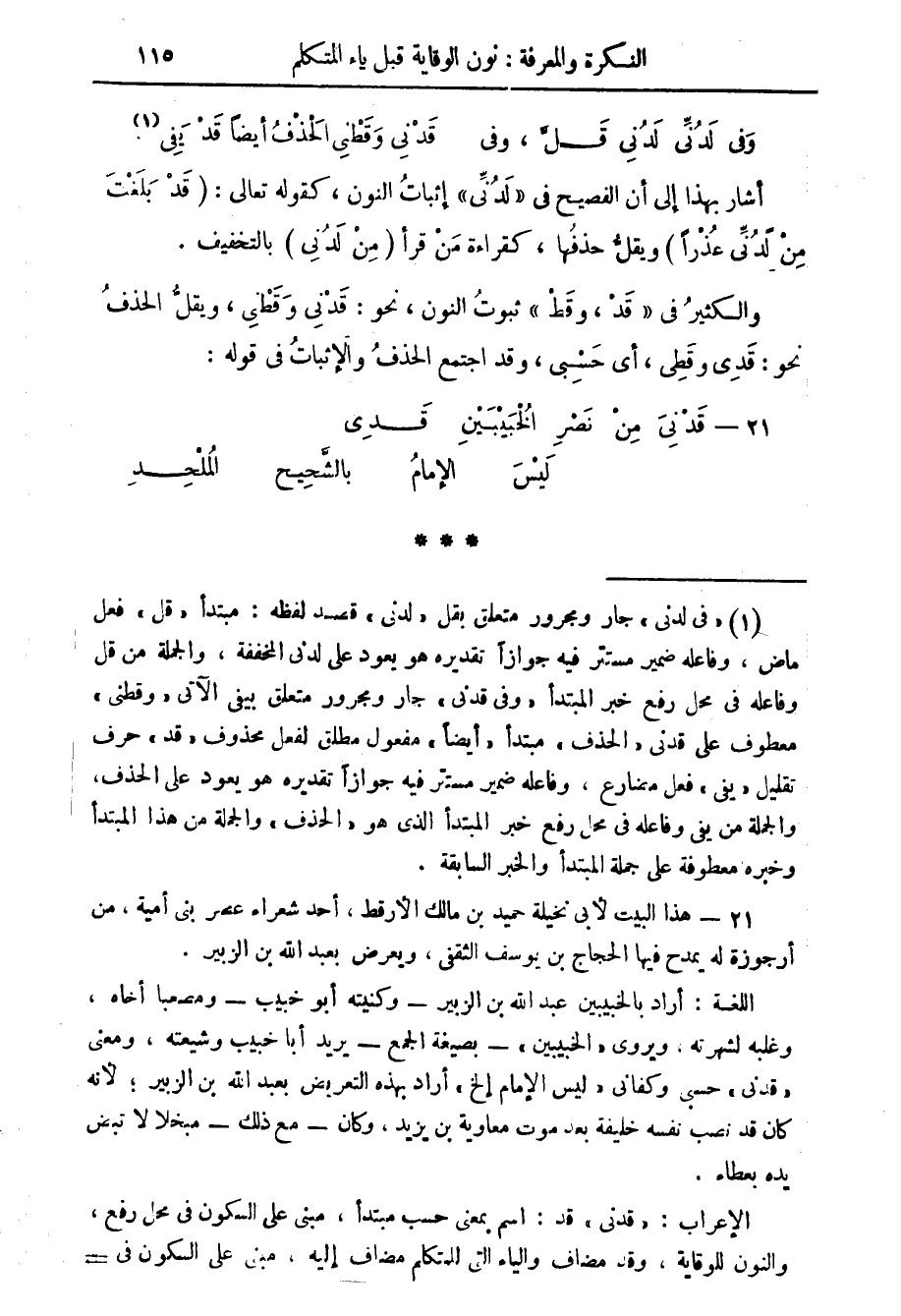 الاعراب: " قدني " قد: اسم بمعنى حسب مبتدأ، مبني على السكون في محل رفع، والنون للوقاية، وقد مضاف والياء التي للمتكلم مضاف إليه مبني على السكون في =