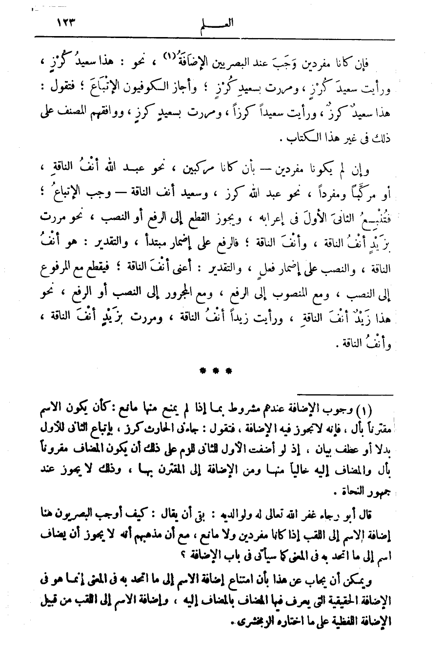 (1) وجوب الاضافة عندهم مشروط بما إذا لم يمنع منها مانع: كأن يكون الاسم مقترنا بأل، فإنه لا تجوز فيه الاضافة، فتقول: جاءني الحارث كرز، بإتباع الثاني للاول بدلا أو عطف بيان، إذ لو أضفت الاول للثاني للزم على ذلك أن يكون المضاف مقرونا بأل والمضاف إليه خاليا منها ومن الاضافة إلى المقترن بها، وذلك لا يجوز عند جمهور النحاة.