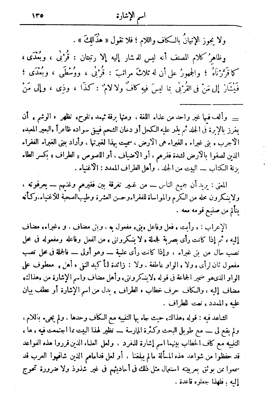 الاعراب: " رأيت " فعل وفاعل " بني " مفعول به، وبني مضاف، و" غبراء " مضاف إليه، ثم إذا كانت رأى بصربة فجملة " لا ينكرونني " من الفعل وفاعله ومفعوله في محل نصب حال من بني غبراء، وإذا كانت رأى علمية وهو أولى فالجملة في محل نصب مفعول ثان لرأى " ولا " الواو عاطفة، ولا: زائدة لتأكيد النفي " أهل " معطوف على الواو الذي هو ضمير الجماعة في قوله " لا ينكرونني " وأهل مضاف واسم الاشارة من " هذاك " مضاف إليه، والكاف حرف خطاب " الطراف " بدل من اسم الاشارة أو عطف بيان عليه " الممدد " نعت للطراف.