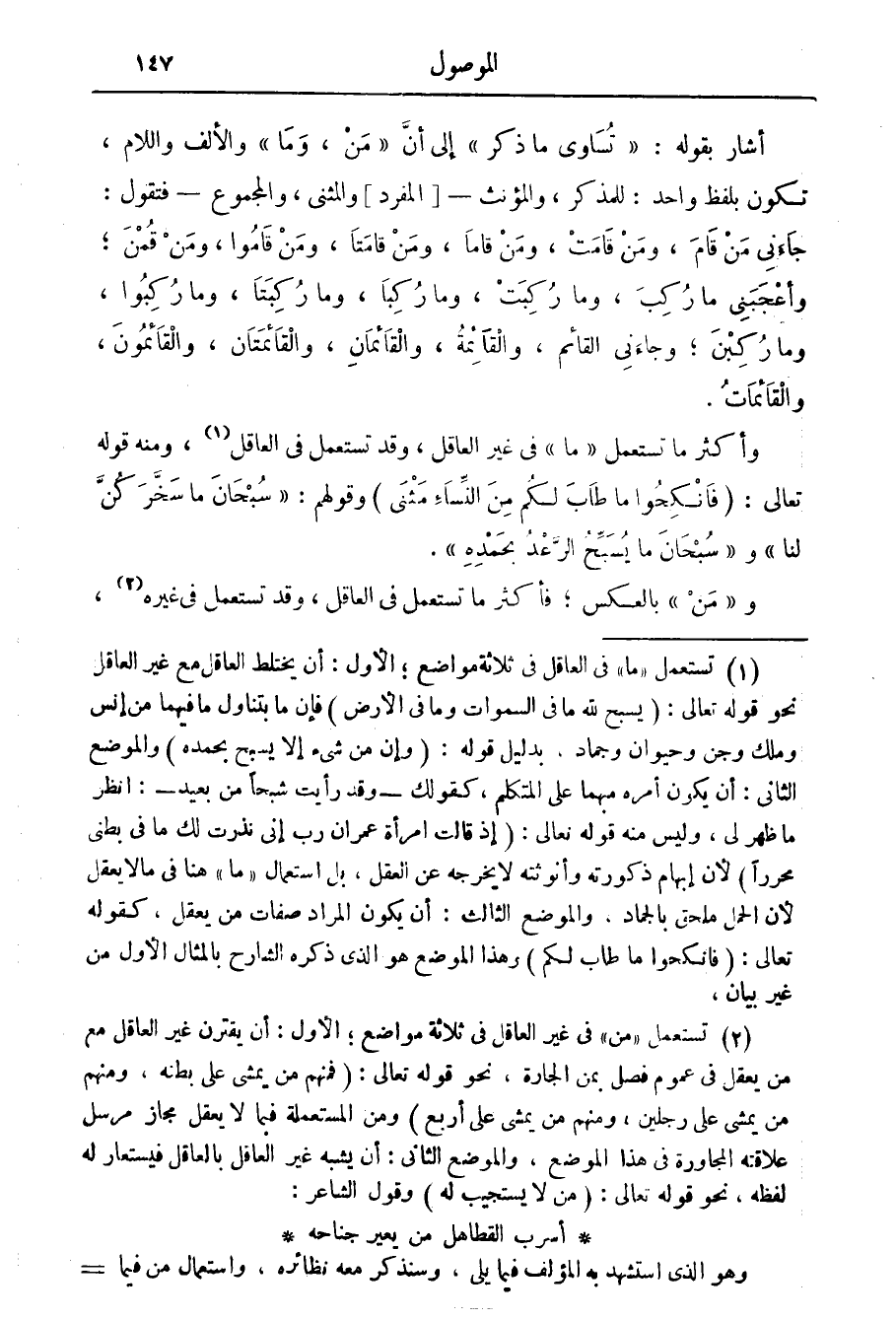 (1) تستعمل " ما " في العاقل في ثلاثة مواضع، الاول: أن يختلط العاقل مع غير العاقل نحو قوله تعالى: (يسبح لله ما في السموات وما في الارض) فإن ما يتناول ما فيهما من إنس وملك وجن وحيوان وجماد، بدليل قوله: (وإن من شئ إلا يسبح بحمده) والموضع الثاني: أن يكون أمره مبهما على المتكلم، كقولك - وقد رأيت شبحا من بعيد -: انظر ما ظهر لي، وليس منه قوله تعالى: (إذ قالت امرأة عمران رب إني نذرت لك ما في بطني محررا) لان إبهام ذكورته وأنوثته لا يخرجه عن العقل، بل استعمال " ما " هنا في ما لا يعقل لان الحمل ملحق بالجماد، والموضع الثالث: أن يكون المراد صفات من يعقل، كقوله تعالى (فانكحوا ما طاب لكم) وهذا الموضع هو الذي ذكره الشارح بالمثال الاول من غير بيان.