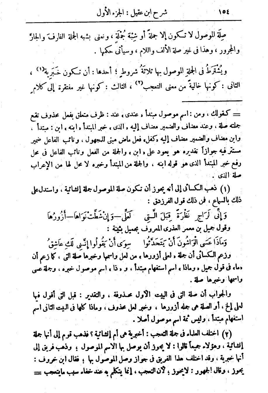 (1) ذهب الكسائي إلى أنه يجوز أن تكون صلة الموصول جملة إنشائية، واستدل على ذلك بالسماع، فمن ذلك قول الفرزدق: وإني لراج نظرة قبل التي لعلي وإن شطت نواها أزورها وقول جميل بن معمر العذري المعروف بجميل بثينة: وماذا عسى الواشون أن يتحدثوا سوى أن يقولوا إنني لك عاشق وزعم الكسائي أن جملة " لعلي أزورها " من لعل واسمها وخبرها صلة التي، كما زعم أن " ما " في قول جميل " وماذا " اسم استفهام مبتدأ، و" ذا " اسم موصول خبره، وجملة عسى واسمها وخبرها صلة.