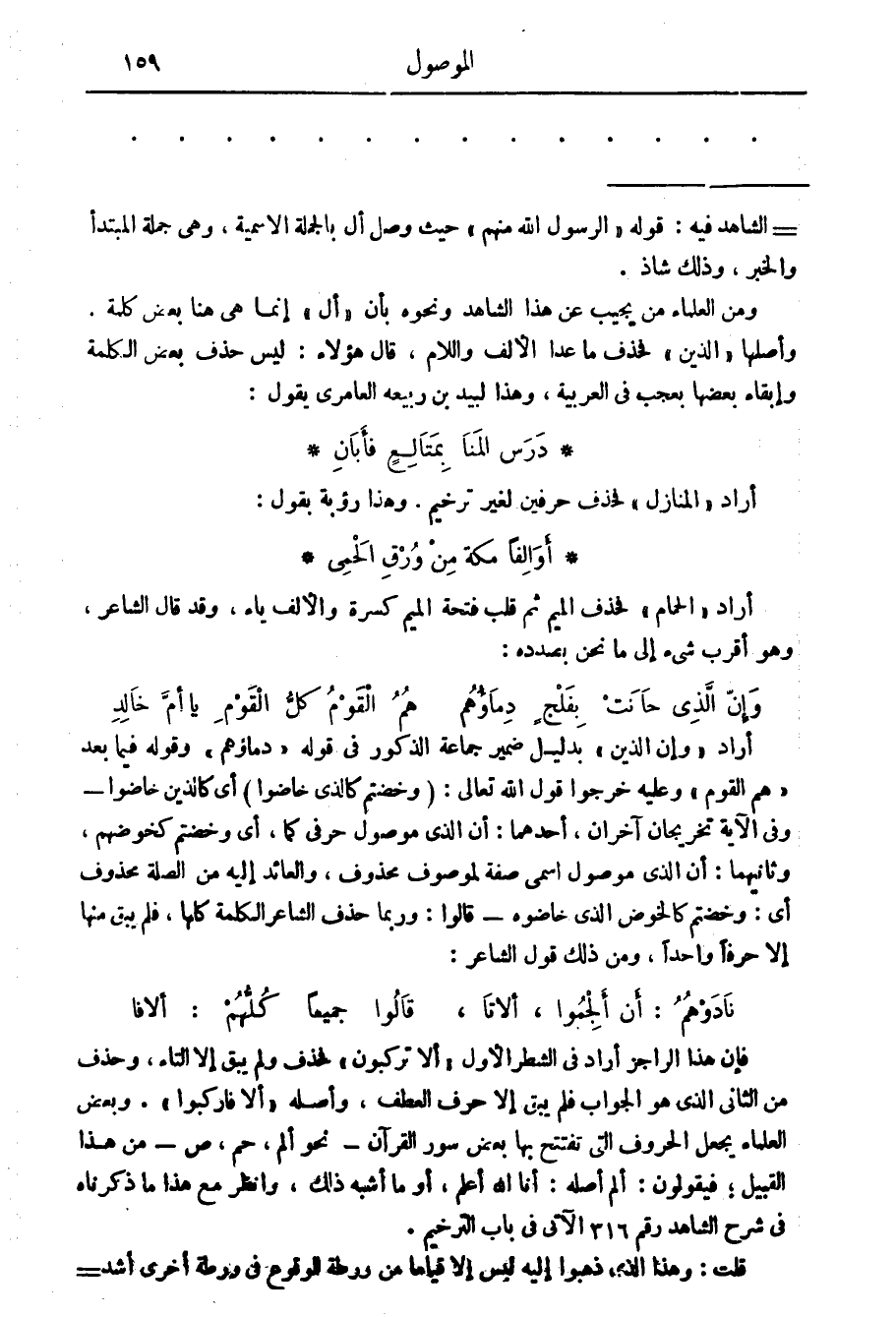 ومن العلماء من يجيب عن هذا الشاهد ونحوه بأن " أل " إنما هي هنا بعض كلمة، وأصلها " الذين " فحذف ما عدا الالف واللام، قال هؤلاء: ليس حذف بعض الكلمة وإبقاء بعضها بعجب في العربية، وهذا لبيد بن ربيعة العامري يقول: درس المنا بمتالع فأبان أراد " المنازل " فحذف حرفين لغير ترخيم.