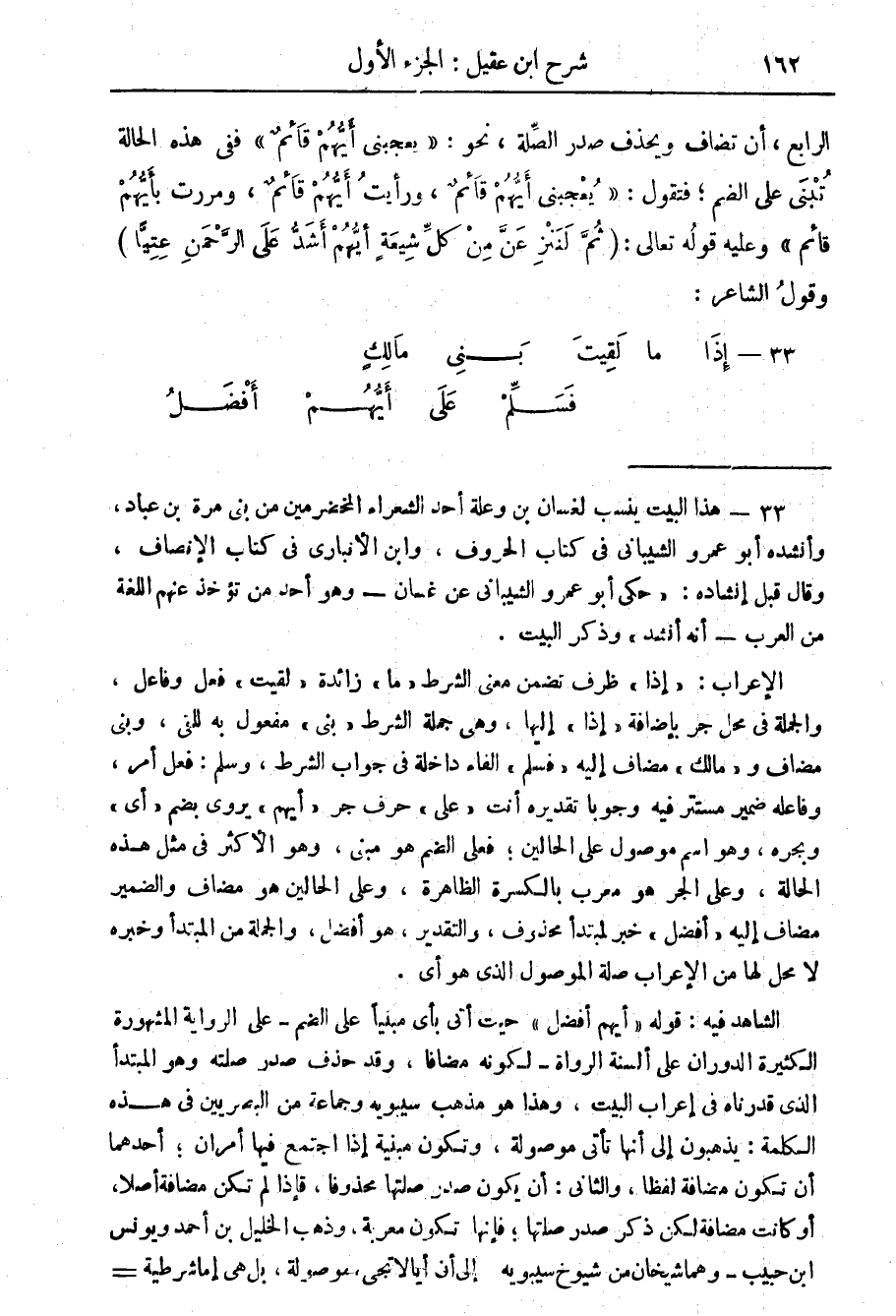 الشاهد فيه: قوله " أيهم أفضل " حيث أتى بأي مبنيا على الضم - على الرواية المشهورة الكثيرة الدوران على ألسنة الرواة - لكونه مضافا، وقد حذف صدر صلته وهو المبتدأ الذي قدرناه في إعراب البيت، وهذا هو مذهب سيبويه وجماعة من البصريين في هذه الكلمة، يذهبون إلى أنها تأتى موصولة، وتكون مبنية إذا اجتمع فيها أمران، أحدهما أن تكون مضافة لفظا، والثاني: أن يكون صدر صلتها محذوفا، فإذا لم تكن مضافة أصلا، أو كانت مضافة لكن ذكر صدر صلتها، فإنها تكون معربة، وذهب الخليل بن أحمد ويونس بن حبيب - وهما شيخان من شيوخ سيبويه - إلى أن =