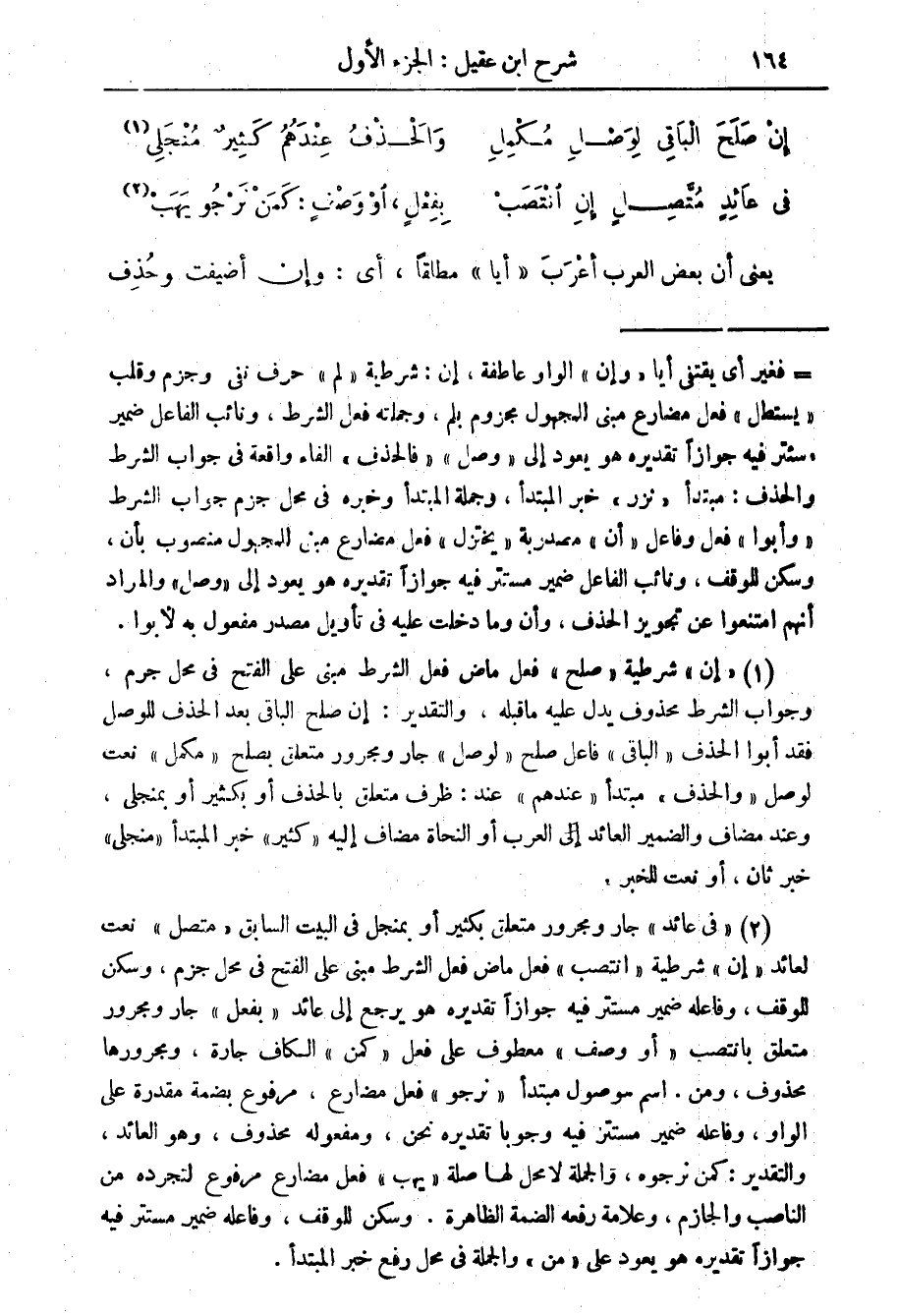 (1) " إن " شرطية " صلح " فعل ماض فعل الشرط مبني على الفتح في محل جزم، وجواب الشرط محذوف يدل عليه ما قبله، والتقدير: إن صلح الباقي بعد الحذف للوصل فقد أبوا الحذف " الباقي " فاعل صلح " لوصل " جار ومجرور متعلق بصلح " مكمل " نعت لوصل " والحذف " مبتدأ " عندهم " عند: ظرف متعلق بالحذف أو بكثير أو بمنجلي، وعند مضاف والضمير العائد إلى العرب أو النحاة مضاف إليه " كثير " خبر المبتدأ " منجلي " خبر ثان، أو نعت للخبر.