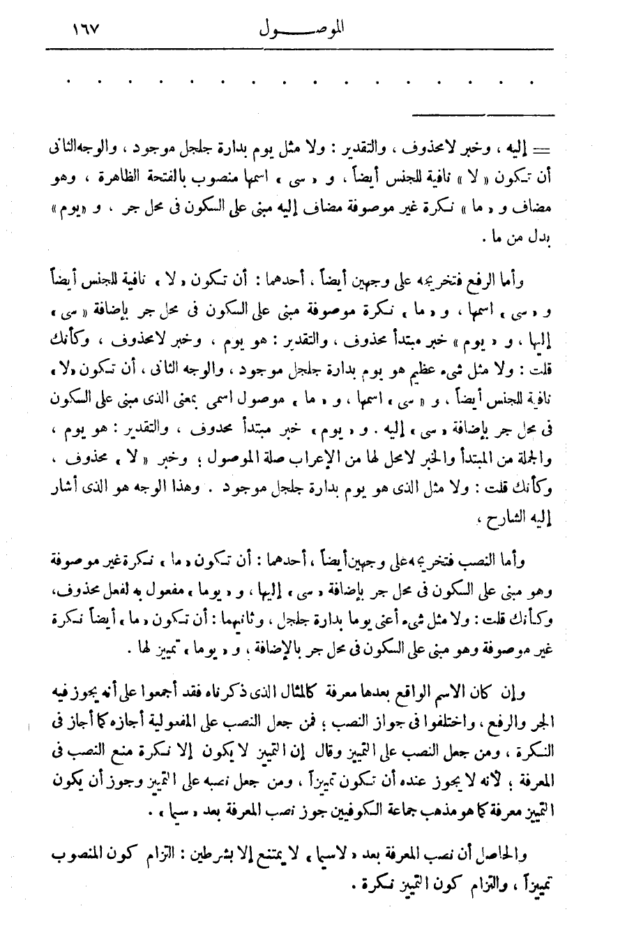 وأما الرفع فتخريجه على وجهين أيضا، أحدهما: أن تكون " لا " نافية للجنس أيضا و" سي " اسمها، و" ما " نكرة موصوفة مبني على السكون في محل جر بإضافة " سي " إليها، و" يوم " خبر مبتدأ محذوف، والتقدير: هو يوم، وخبر لا محذوف، وكأنك قلت: ولا مثل شئ عظيم هو يوم بدارة جلجل موجود، والوجه الثاني، أن تكون " لا " نافية للجنس أيضا، و" سي " اسمها، و" ما " موصول اسمي بمعنى الذي مبني على السكون في محل جر بإضافة " سي " إليه، و" يوم " خبر مبتدأ محذوف، والتقدير هو يوم، والجملة من المبتدأ والخبر لا محل لها من الاعراب صلة الموصول، وخبر " لا " محذوف، وكأنك قلت: ولا مثل الذي هو يوم بدارة جلجل موجود.