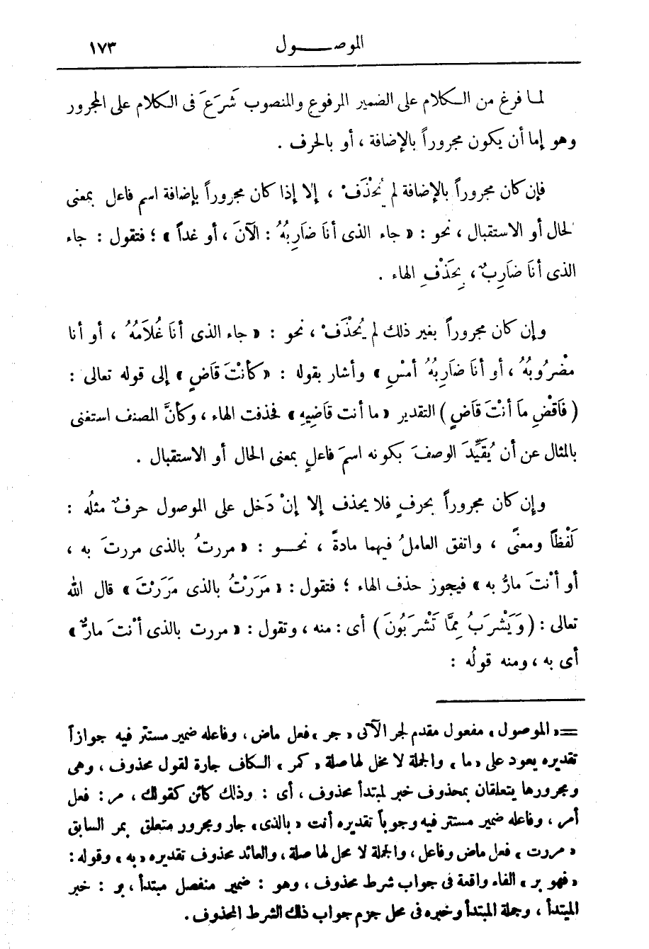 فإن كان مجرورا بالإضافة لم يحذف إلا إذا كان مجرورا بإضافة اسم فاعل بمعنى الحال أو الاستقبال نحو جاء الذي أنا ضاربه الآن أو غدا فتقول جاء الذي أنا ضارب بحذف الهاء وإن كان مجرورا بغير ذلك لم يحذف نحو جاء الذي أنا غلامه أو أنا مضروبه أو أنا ضاربه أمس وأشار بقوله كأنت قاض إلى قوله تعالى: {فَاقْضِ مَا أَنْتَ قَاضٍ} التقدير ما أنت قاضيه فحذفت الهاء وكأن المصنف استغنى بالمثال عن أن يقيد الوصف بكونه اسم فاعل بمعنى الحال أو الاستقبال.