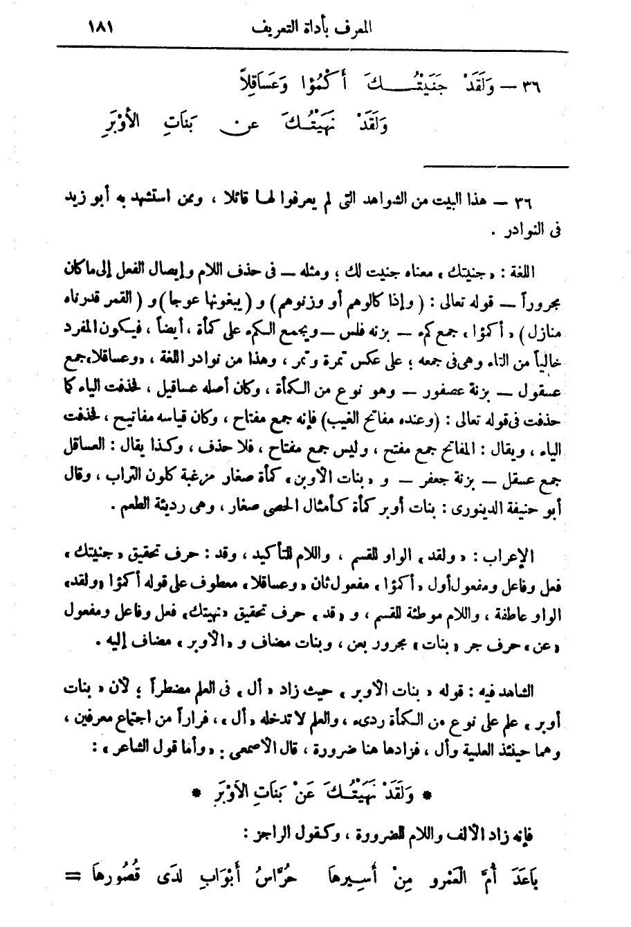الاعراب: " ولقد " الواو للقسم، واللام للتأكيد، وقد: حرف تحقيق " جنيتك " فعل وفاعل ومفعول أول " أكمؤا " مفعول ثان " وعساقلا " معطوف على قوله أكمؤا " ولقد " الواو عاطفة، واللام موطئة للقسم، و" قد " حرف تحقيق " نهيتك " فعل وفاعل ومفعول " عن " حرف جر " بنات " مجرور بعن، وبنات مضاف و" الاوبر " مضاف إليه.