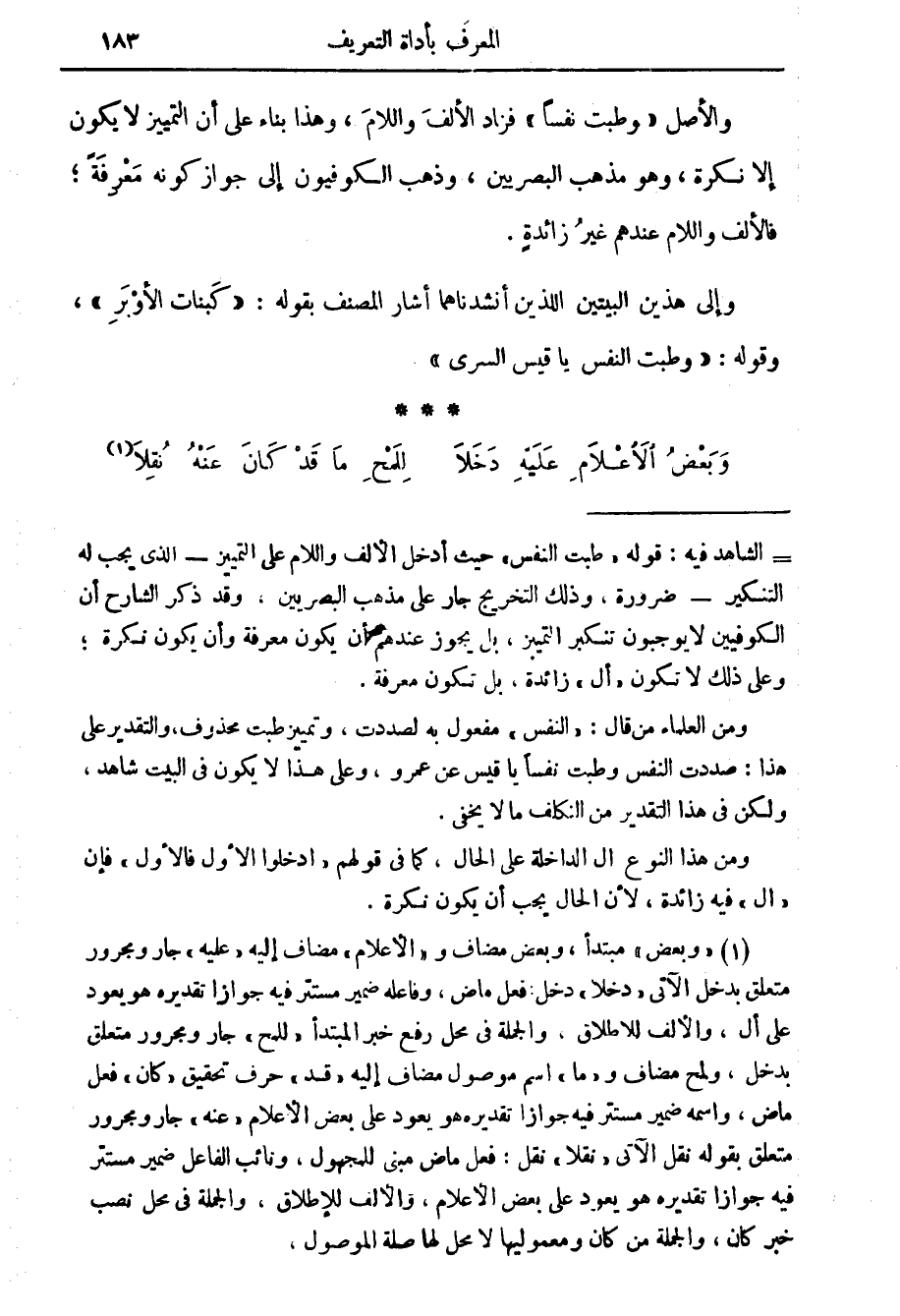 (1) " وبعض " مبتدأ، وبعض مضاف و" الاعلام " مضاف إليه " عليه " جار ومجرور متعلق بدخل الآتي " دخلا " دخل فعل ماض، وفاعله ضمير مستتر فيه جوازا تقديره هو يعود على أل، والالف للاطلاق، والجملة في محل رفع خبر المبتدأ " للمح " جار ومجرور متعلق بدخل، ولمح مضاف و" ما " اسم موصول مضاف إليه " قد " حرف تحقيق " كان " فعل ماض، واسمه ضمير مستتر فيه جوازا تقديره هو يعود على بعض الاعلام " عنه " جار ومجرور متعلق بقوله نقل الآتي " نقلا " نقل: فعل ماض مبني للمجهول، ونائب الفاعل ضمير مستتر فيه جوازا تقديره هو يعود على بعض الاعلام، والالف للاطلاق، والجملة في محل نصب خبر كان، والجملة من كان ومعموليها لا محل لها صلة الموصول.