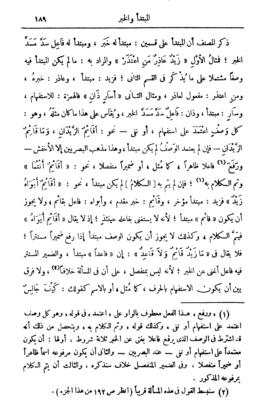 ذكر المصنف أن المبتدأ على قسمين مبتدأ له خبر ومبتدأ له فاعل سد مسد الخبر فمثال الأول زيد عاذر من اعتذر والمراد به ما لم يكن المبتدأ فيه وصفا مشتملا على ما يذكر في القسم الثاني فزيد مبتدأ وعاذر خبره ومن اعتذر مفعول لعاذر ومثال الثاني أسار ذان فالهمزة للاستفهام وسار مبتدأ وذان فاعل سد مسد الخبر ويقاس على هذا ما كان مثله وهو كل وصف اعتمد على استفهام أو نفي نحو أقائم الزيدان وما قائم الزيدان فإن لم يعتمد الوصف لم يكن مبتدأ وهذا مذهب البصريين إلا الأخفش ورفع (1) فاعلا ظاهرا كما مثل أو ضميرا منفصلا نحو أقائم أنتما وتم الكلام به (1) فإن لم يتم به الكلام لم يكن مبتدأ نحو أقائم أبواه زيد فزيد مبتدأ مؤخر وقائم خبر مقدم وأبواه فاعل بقائم ولا يجوز أن يكون قائم مبتدأ لأنه لا يستغني بفاعله حينئذ إذ لا يقال أقائم أبواه فيتم الكلام وكذلك لا يجوز أن يكون الوصف مبتدأ إذا رفع ضميرا مستترا فلا يقال في ما زيد قائم ولا قاعد إن قاعدا مبتدأ والضمير المستتر فيه فاعل أغنى عن الخبر لأنه ليس بمنفصل على أن في المسألة خلافا (2) ولا فرق بين أن يكون الاستفهام