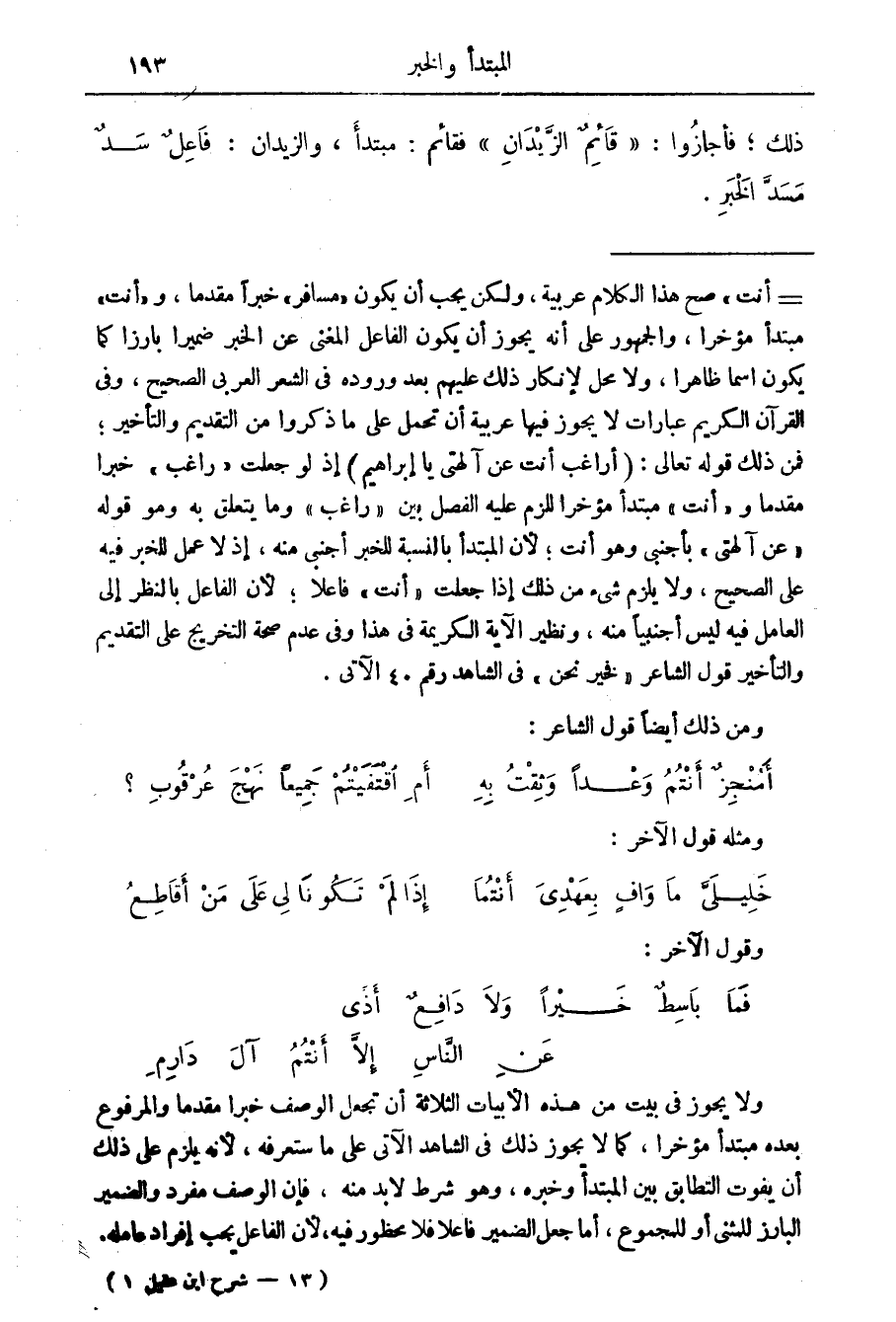 أنت " صح هذا الكلام عربية، ولكن يجب أن يكون " مسافر " خبرا مقدما، و" أنت " مبتدأ مؤخرا، والجمهور على أنه يجوز أن يكون الفاعل المغنى عن الخبر ضميرا بارزا كما يكون اسما ظاهرا، ولا محل لانكار ذلك عليهم بعد وروده في الشعر العربي الصحيح، وفي القرآن الكريم عبارات لا يجوز فيها عربية أن تحمل على ما ذكروا من التقديم والتأخير، فمن ذلك قوله تعالى: (أراغب أنت عن آلهتي يا إبراهيم) إذ لو جعلت " راغب " خبرا مقدما و" أنت " مبتدأ مؤخرا للزم عليه الفصل بين " راغب " وما يتعلق به وهو قوله " عن آلهتي " بأجنبي وهو أنت، لان المبتدأ بالنسبة للخبر أجنبي منه، إذ لا عمل للخبر فيه على الصحيح، ولا يلزم شئ من ذلك إذا جعلت " أنت " فاعلا، لان الفاعل بالنظر إلى العامل فيه ليس أجنبيا منه ونظير الآية الكريمة في هذا وعدم صحة التخريج على التقديم والتأخير قول الشاعر " فخير نحن " في الشاهد رقم 40 الآتي.