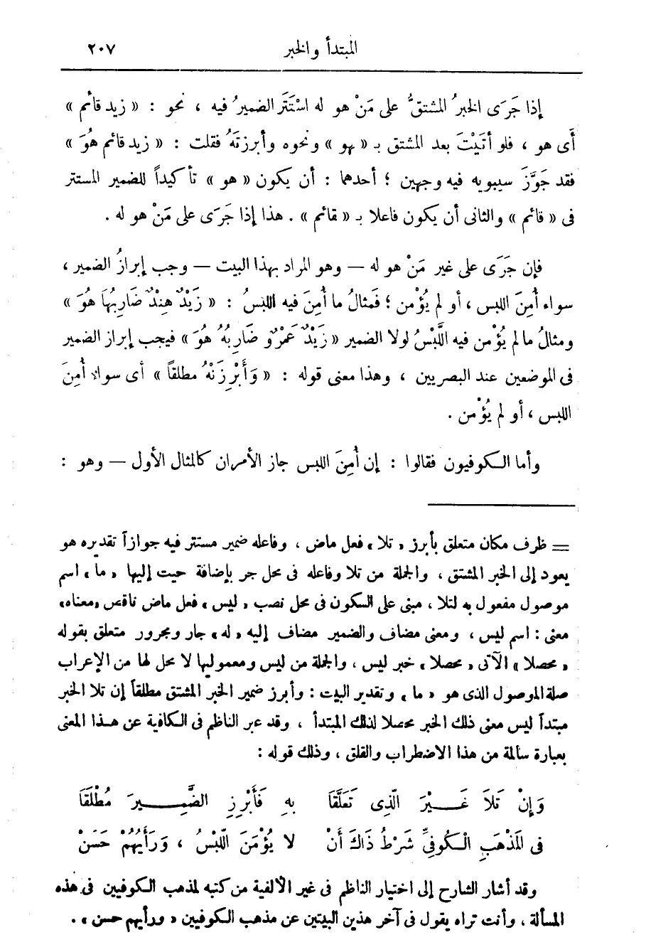 والقلق، وذلك قوله: وإن تلا غير الذي تعلقا به فأبرز الضمير مطلقا في المذهب الكوفي شرط ذاك أن لا يؤمن اللبس، ورأيهم حسن وقد أشار الشارح إلى اختيار الناظم في غير الالفية من كتبه لمذهب الكوفيين في هذه المسألة، وأنت تراه يقول في آخر هذين البيتين عن مذهب الكوفيين " ورأيهم حسن ".