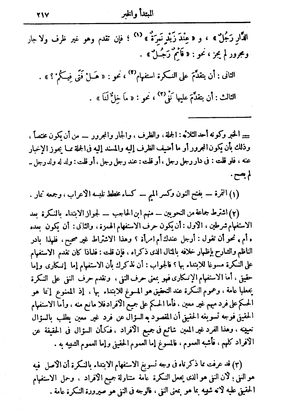 (2) اشترط جماعة من النحويين - منهم ابن الحاجب - لجواز الابتداء بالنكرة بعد الاستفهام شرطين، الاول: أن يكون حرف الاستفهام الهمزة، والثاني: أن يكون بعده " أم " نحو أن تقول: أرجل عندك أم امرأة؟ وهذا الاشتراط غير صحيح، فلهذا بادر الناظم والشارح بإظهار خلافه بالمثال الذي ذكراه، فإن قلت: فلماذا كان تقدم الاستفهام على النكرة مسوغا للابتداء بها؟ فالجواب: أن نذكرك بأن الاستفهام إما إنكاري وإما حقيقي، أما الاستفهام الانكاري فهو بمعنى حرف النفي، وتقدم حرف النفي على النكرة يجعلها عامة، وعموم النكرة عند التحقيق هو المسوغ للابتداء بها، إذ الممنوع إنما هو الحكم على فرد مبهم غير معين، فأما الحكم على جميع الافراد فلا مانع منه، وأما الاستفهام الحقيقي فوجه تسويغه أن المقصود به السؤال عن فرد غير معين بطلب بالسؤال تعيينه، وهذا الفرد غير المعين شائع في جميع الافراد، فكأن السؤال في الحقيقة عن الافراد كلهم، فأشبه العموم، فالمسوغ إما العموم الحقيقي وإما العموم الشبيه به.