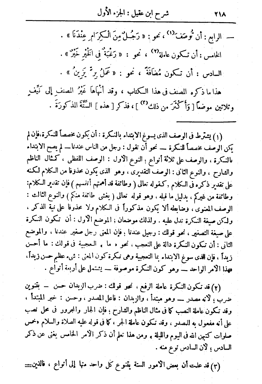 (1) يشترط في الوصف الذي يسوغ الابتداء بالنكرة أن يكون مخصصا للنكرة فإن لم يكن الوصف مخصصا للنكرة - نحو أن تقول: رجل من الناس عندنا لم يصح الابتداء بالنكرة، والوصف على ثلاثة أنواع، النوع الاول: الوصف اللفظي، كمثال الناظم والشارح، والنوع الثاني: الوصف التقديري، وهو الذي يكون محذوفا من الكلام لكنه على تقدير ذكره في الكلام، كقوله تعالى (وطائفة قد أهمتهم أنفسهم) فإن تقدير الكلام: وطائفة من غيركم، بدليل ما قبله، وهو قوله تعالى (يغشى طائفة منكم) والنوع الثالث: الوصف المعنوي، وضابطه ألا يكون مذكورا في الكلام ولا محذوفا على نية الذكر، ولكن صيغة النكرة تدل عليه، ولذلك موضعان، الموضع الاول: أن تكون النكرة على صيغة التصغير، نحو قولك: رجيل عندنا، فإن المعنى رجل صغير عندنا، والموضع الثاني: أن تكون النكرة دالة على التعجب، نحو " ما " التعجبية في قولك: ما أحسن زيدا، فإن الذي سوغ الابتداء بما التعجبية وهي نكرة كون المعنى: شئ عظيم حسن زيدا، فهذا الامر الواحد وهو كون النكرة موصوفة - يشتمل على أربعة أنواع.