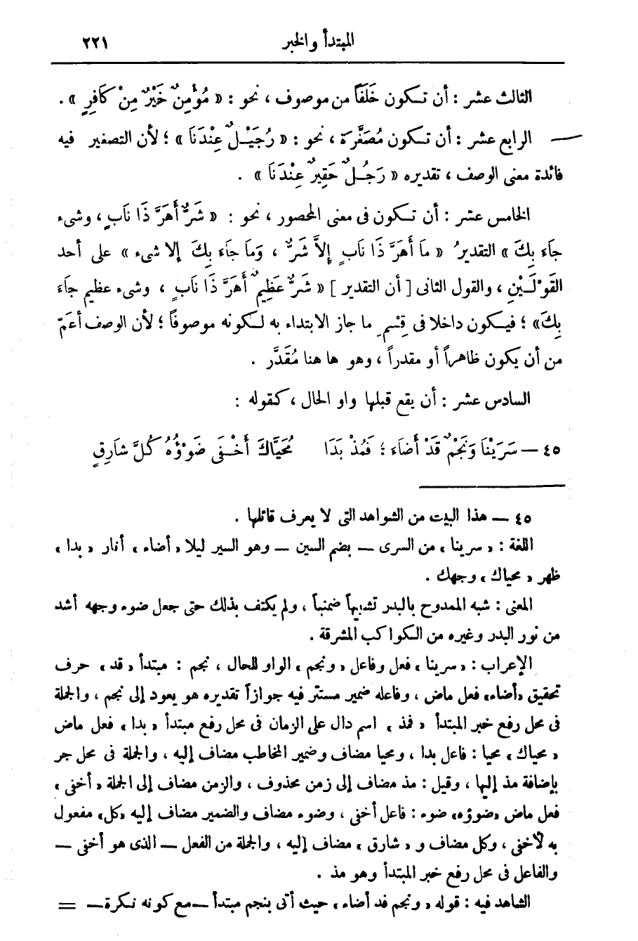 الاعراب: " سرينا " فعل وفاعل " ونجم " الواو للحال، نجم: مبتدأ " قد " حرف تحقيق " أضاء " فعل ماض، وفاعله ضمير مستتر فيه جوازا تقديره هو يعود إلى نجم، والجملة في محل رفع خبر المبتدأ " فمذ " اسم دال على الزمان في محل رفع مبتدأ " بدا " فعل ماض " محياك " محيا: فاعل بدا، ومحيا مضاف وضمير المخاطب مضاف إليه، والجملة في محل جر بإضافة مذ إليها، وقيل: مذ مضاف إلى زمن محذوف، والزمن مضاف إلى الجملة " أخفى " فعل ماض " ضوؤه " ضوء: فاعل أخفى، وضوء مضاف والضمير مضاف إليه " كل " مفعول به لاخفى، وكل مضاف و" شارق " مضاف إليه، والجملة من الفعل - الذي هو أخفى - والفاعل في محل رفع خبر المبتدأ وهو مذ.