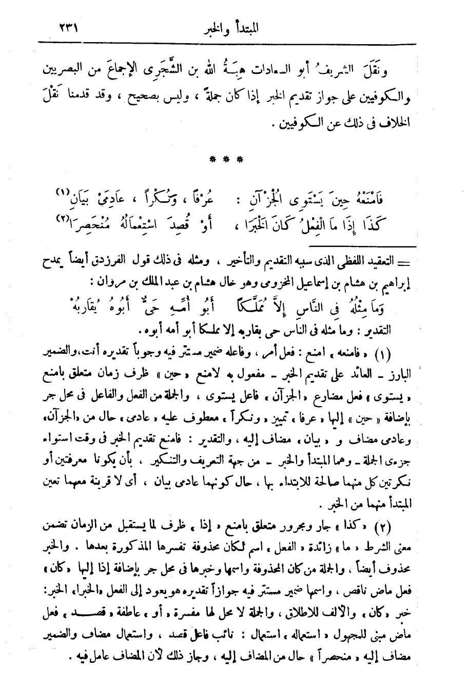 ونقل الشريف أبو السعادات هبة الله بن الشجري الإجماع من البصريين والكوفيين على جواز تقديم الخبر إذا كان جملة وليس بصحيح وقد قدمنا نقل الخلاف في ذلك عن الكوفيين.