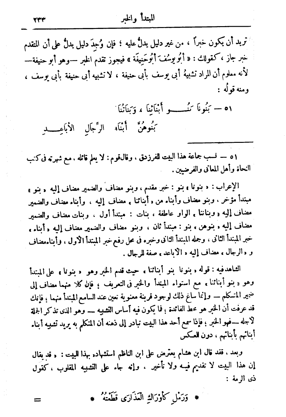 الشاهد فيه: قوله " بنونا بنو أبنائنا " حيث قدم الخبر وهو " بنونا " على المبتدأ وهو " بنو أبنائنا " مع استواء المبتدأ والخبر في التعريف، فإن كلا منهما مضاف إلى ضمير المتكلم - وإنما ساغ ذلك لوجود قرينة معنوية تعين المبتدأ منهما، فإنك قد عرفت أن الخبر هو محط الفائدة، فما يكون فيه أساس التشبيه وهو الذي تذكر الجملة لاجله - فهو الخبر.