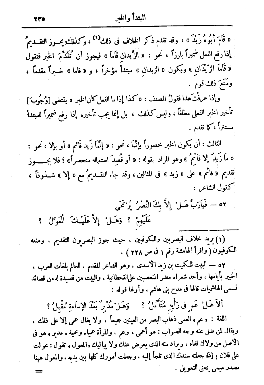 (1) يريد خلاف البصريين والكوفيين، حيث جوز البصريون التقديم، ومنعه الكوفيون (واقرأ الهامشة رقم 1 في ص 228) .