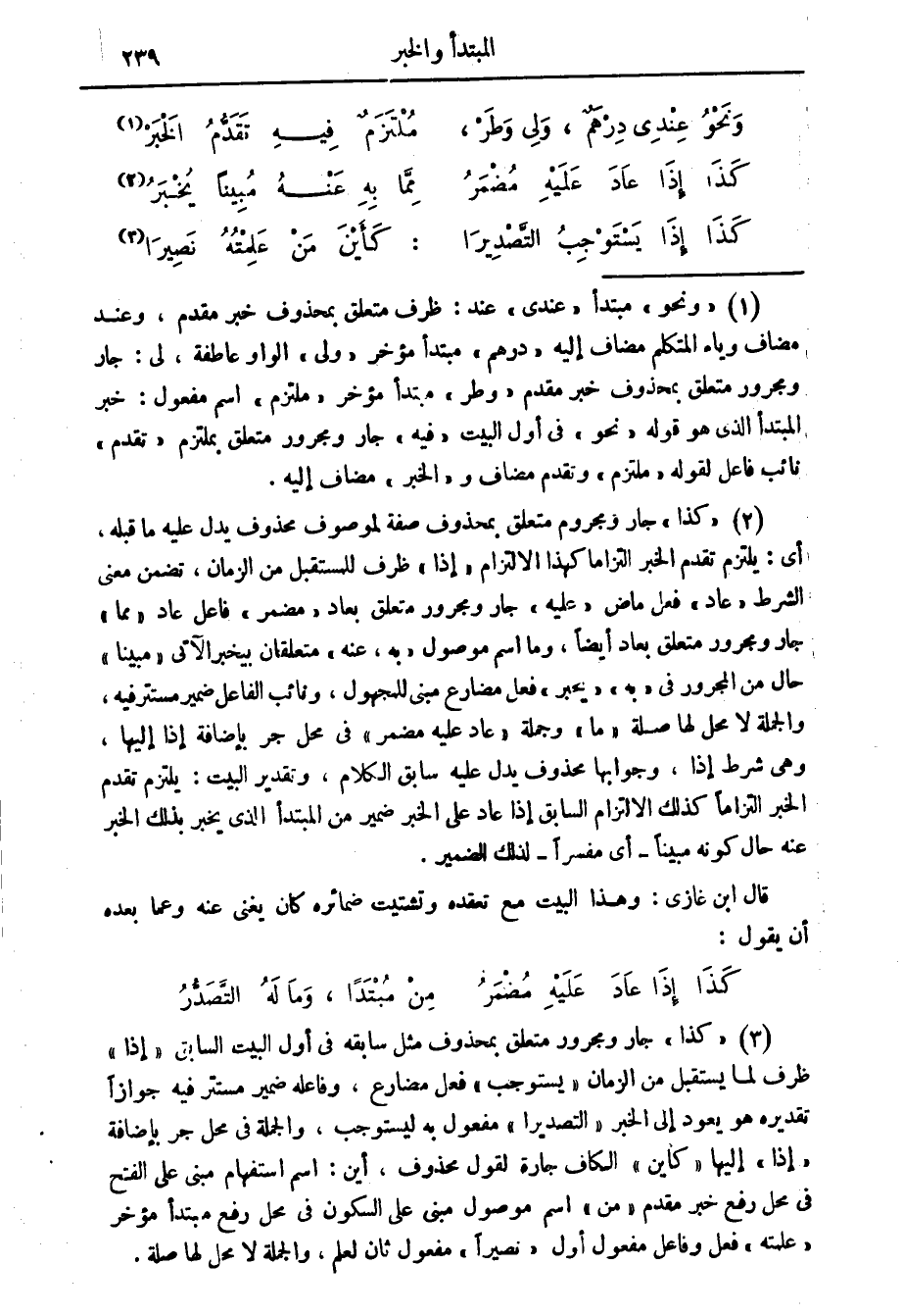 قال ابن غازي: وهذا البيت مع تعقده وتشتيت ضمائره كان يغنى عنه وعما بعده أن يقول: كذا إذا عاد عليه مضمر من مبتدا، وما له التصدر (3) " كذا " جار ومجرور متعلق بمحذوف مثل سابقه في أول البيت السابق " إذا " ظرف لما يستقبل من الزمان " يستوجب " فعل مضارع، وفاعله ضمير مستتر فيه جوازا تقديره هو يعود إلى الخبر " التصديرا " مفعول به ليستوجب، والجملة في محل جر بإضافة " إذا " إليها " كأين " الكاف جارة لقول محذوف، أين: اسم استفهام مبني على الفتح في محل رفع خبر مقدم " من " اسم موصول مبني على السكون في محل رفع مبتدأ مؤخر " علمته " فعل وفاعل ومفعول أول " نصيرا " مفعول ثان لعلم،