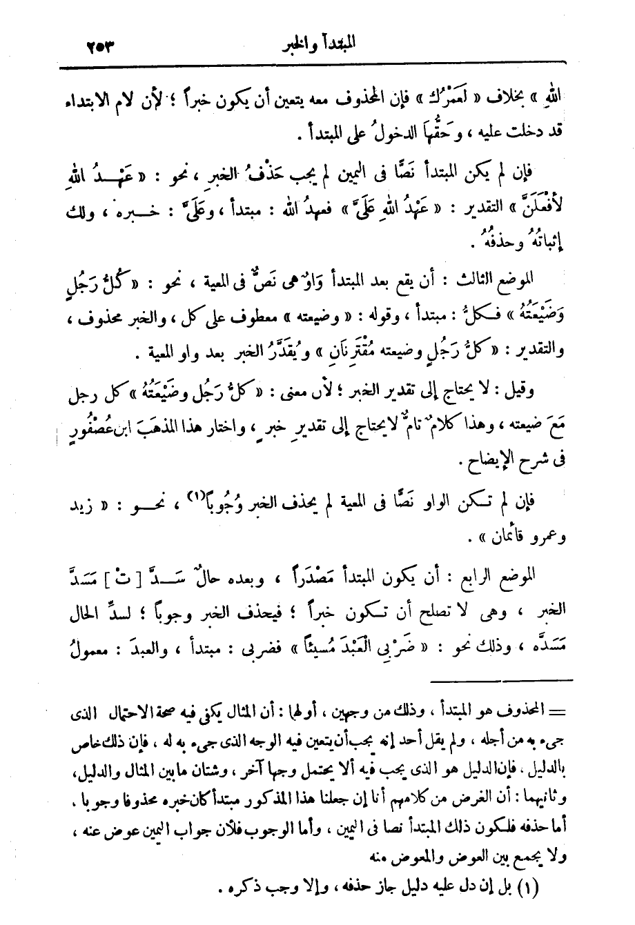 = المحذوف هو المبتدأ، وذلك من وجهين، أولهما: أن المثال يكفي فيه صحة الاحتمال الذي جئ به من أجله، ولم يقل أحد إنه يجب أن يتعين فيه الوجه الذي جئ به له، وثانيهما: أن الغرض من كلامهم أنا إن جعلنا هذا المذكور مبتدأ كان خبره محذوفا