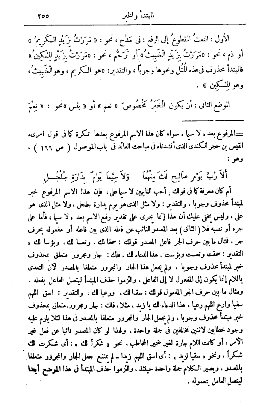 = المرفوع بعد " لا سيما " سواء كان هذا الاسم المرفوع بعدها نكرة كما في قول امرئ القيس بن حجر الكندي الذي أنشدناه في مباحث العائد في باب الموصول (ص 166) ، وهو: ألا رب يوم صالح لك منهما ولا سيما يوم بدارة جلجل أم كان معرفة كما في قولك: أحب النابهين لا سيما علي، فإن هذا الاسم المرفوع خبر لمبتدأ محذوف وجوبا، والتقدير: ولا مثل الذي هو يوم بدارة جلجل، ولا مثل الذي هو علي، وليس يخفى عليك أن هذا إنما يجري على تقدير رفع الاسم بعد " لا سيما " فأما على جره أو نصبه فلا (الثاني) بعد المصدر النائب عن فعله الذي بين فاعله أو مفعوله بحرف جر، فمثال ما بين حرف الجر فاعل المصدر قولك: سحقا لك، وتعسا لك، وبؤسا لك، التقدير: سحقت وتعست وبؤست، هذا الدعاء لك، فلك: جار ومجرور متعلق بمحذوف خبر لمبتدأ محذوف وجوبا، ولم يجعل هذا الجار والمجرور متعلقا بالمصدر لان التعدي باللام إنما يكون إلى المفعول لا إلى الفاعل، والتزموا حذف المبتدأ ليتصل الفاعل بفعله، ومثال ما بين حرف الجر المفعول قولك: سقيا لك، ورعيا