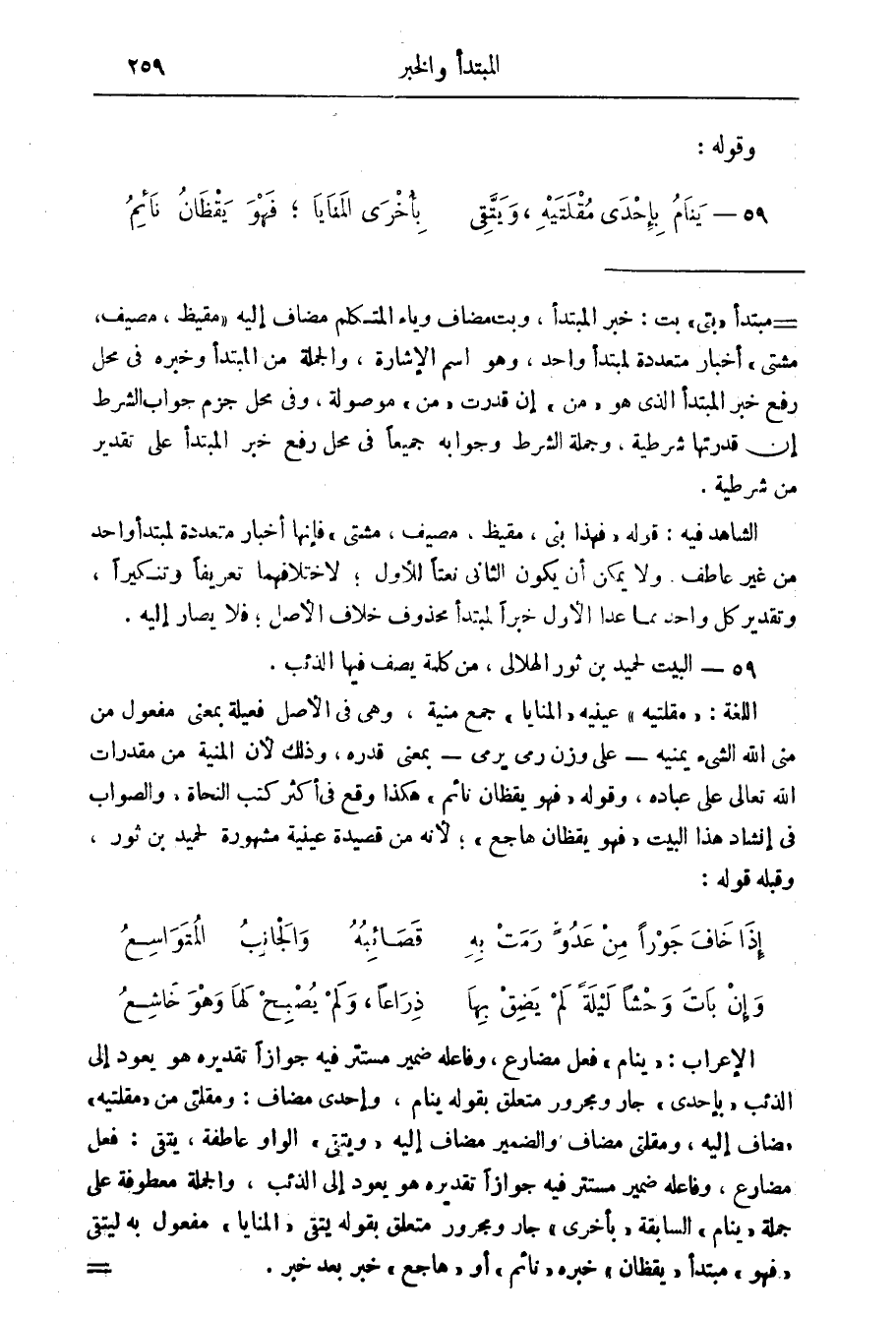 اللغة: " مقلتيه " عينيه " المنايا " جمع منية، وهي في الاصل فعيلة بمعنى مفعول من منى الله الشئ يمنيه - على وزن رمى يرمي - بمعنى قدره، وذلك لان المنية من مقدرات الله تعالى على عباده، وقوله " فهو يقظان نائم " هكذا وقع في أكثر كتب النحاة، والصواب في إنشاد هذا البيت " فهو يقظان هاجع "، لانه من قصيدة عينية مشهورة لحميد بن ثور، وقبله قوله: إذا خاف جورا من عدو رمت به قصائبه والجانب المتواسع وإن بات وحشا ليلة لم يضق بها ذراعا، ولم يصبح لها وهو خاشع الاعراب: " ينام " فعل مضارع، وفاعله ضمير مستتر فيه جوازا تقديره هو يعود إلى الذئب " بإحدى " جار ومجرور متعلق بقوله ينام، وإحدى مضاف، ومقلتي من " مقلتيه " مضاف إليه، ومقلتي مضاف والضمير مضاف إليه " ويتقي " الواو عاطفة، يتقي: فعل مضارع، وفاعله ضمير مستتر فيه جوازا تقديره هو يعود إلى الذئب، والجملة معطوفة على جملة " ينام " السابقة " بأخرى " جار ومجرور متعلق بقوله يتقي " المنايا " مفعول به ليتقي " فهو " مبتدأ " يقظان " خبره " نائم " أو " هاجع " خبر بعد خبر.