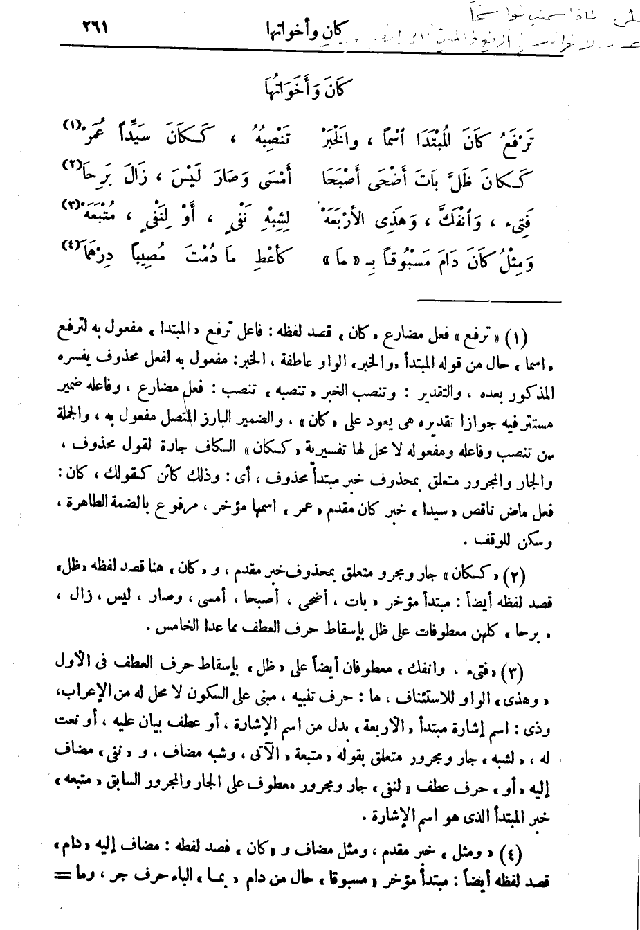 (2) " ككان " جار ومجرور متعلق بمحذوف خبر مقدم، و" كان " هنا قصد لفظه " ظل " قصد لفظه أيضا: مبتدأ مؤخر " بات، أضحى، أصبحا، أمسى، وصار ليس، زال، برحا " كلهن معطوفات على ظل بإسقاط حرف العطف مما عدا الخامس.