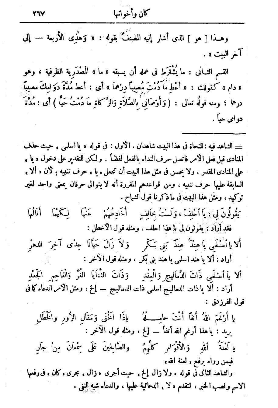 يقولون لي: يا احلف، ولست بحالف أخادعهم عنها لكيما أنالها فقد أراد: يقولون لي يا هذا احلف، ومثله قول الاخطل: ألا يا اسلمي يا هند هند بني بكر ولا زال حيانا عدى آخر الدهر أراد: ألا يا هند اسلمي يا هند بني بكر، ومثله قول الآخر: ألا يا اسلمي ذات الدماليج والعقد وذات الثنايا الغر والفاحم الجعد أراد: ألا يا ذات الدماليج اسلمي ذات الدماليج إلخ، ومثل الامر الدعاء كما في قول الفرزدق: يا أرغم الله أنفا أنت حامله يا ذا الخنى ومقال الزور والخطل
