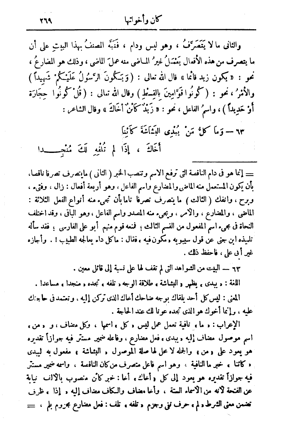 والثاني: ما لا يتصرف، وهو ليس ودام فنبه المصنف بهذا البيت على أن ما يتصرف من هذه الأفعال يعمل غير الماضي منه عمل الماضي وذلك هو المضارع نحو يكون زيد قائما قال الله تعالى: {وَيَكُونَ الرَّسُولُ عَلَيْكُمْ شَهِيداً} والأمر نحو كونوا قوامين بالقسط وقال الله تعالى: {قُلْ كُونُوا حِجَارَةً أَوْ حَدِيداً} واسم الفاعل نحو زيد كائن أخاك وقال الشاعر: