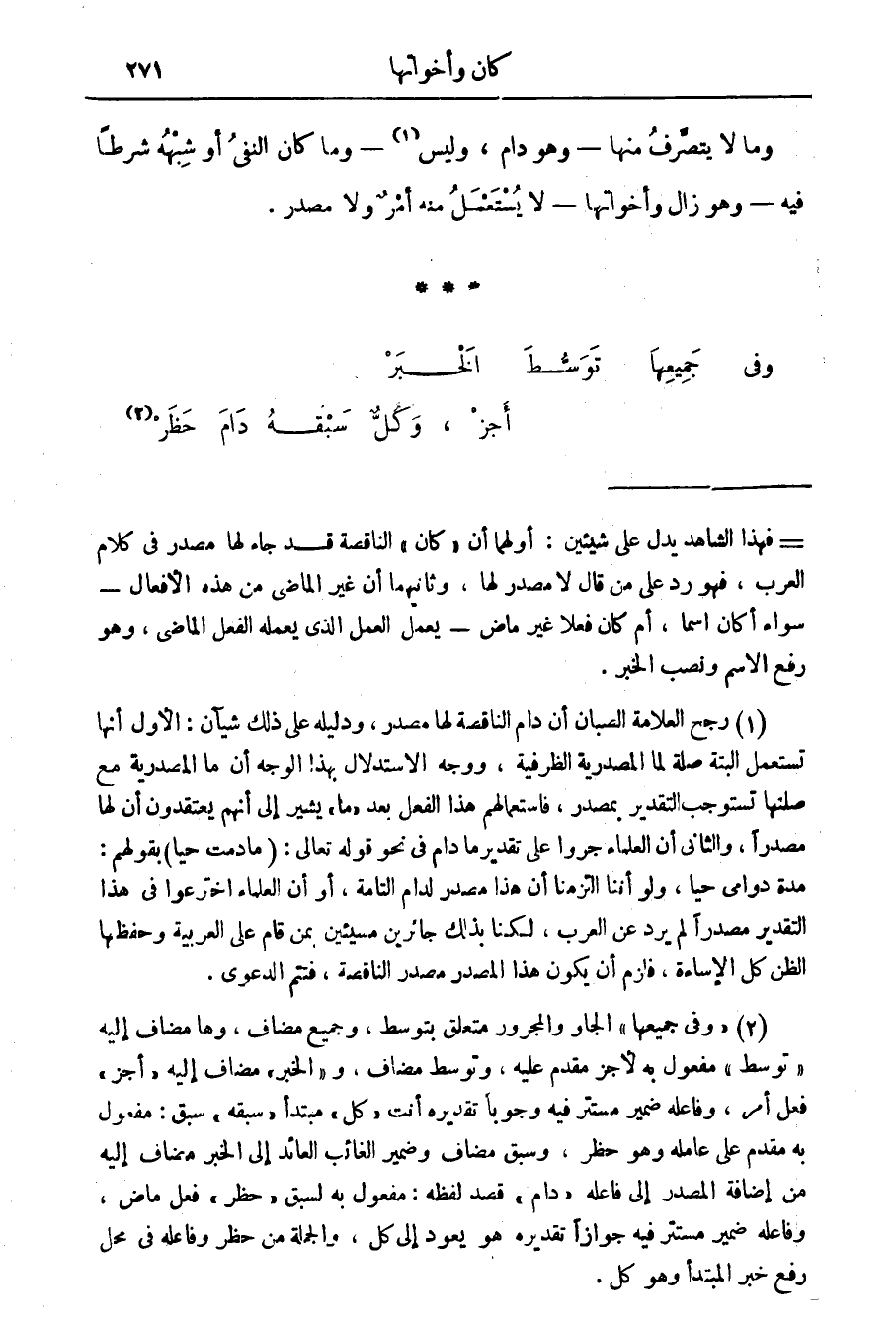(1) رجح العلامة (الصبان) ؟ أن الناقصة لها مصدر، ودليله على ذلك شيئان: الاول أنها تستعمل البتة صلة لما المصدرية الظرفية، ووجه الاستدلال بهذا الوجه أن ما المصدرية مع صلتها تستوجب التقدير بمصدر، فاستعمالهم هذا الفعل بعد ما يشير إلى أنهم يعتقدون أن لها مصدرا، والثاني أن العلماء جروا على تقدير ما دام في نحو قوله تعالى: (مادمت حيا) بقولهم: مدة دوامي حيا، ولو أننا التزمنا أن هذا مصدر لدام التامة، أو أن العلماء اخترعوا في هذا التقدير مصدرا لم يرد عن العرب، لكنا بذلك جائرين مسيئين بمن قام على العربية وحفظها الظن كل الاساءة، فلزم أن يكون هذا المصدر مصدر الناقصة فتتم الدعوى.