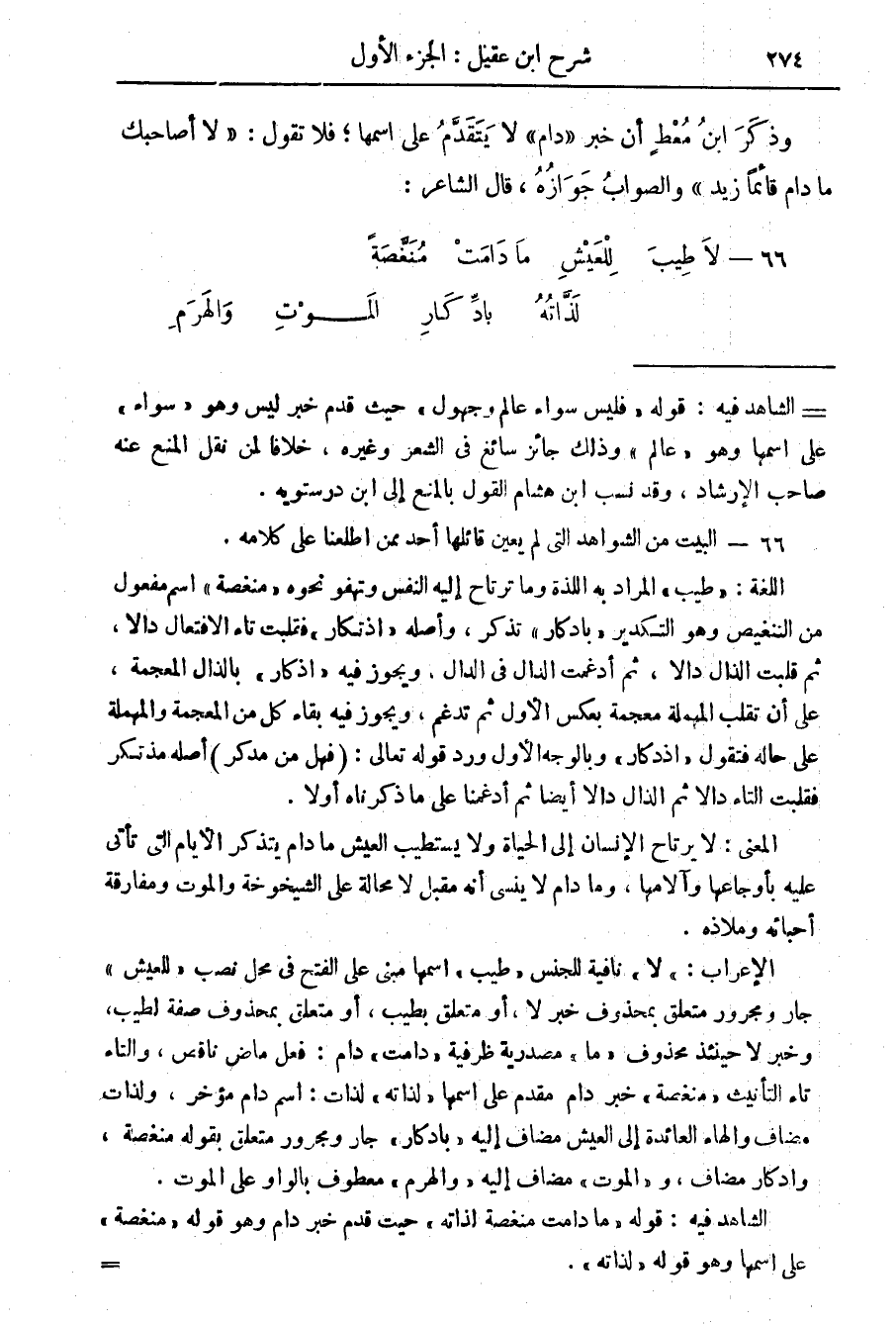 الشاهد فيه: قوله " مادامت منغصة لذاته " حيث قدم خبر دام وهو قوله " منغصة " على اسمها وهو قوله " لذاته ".