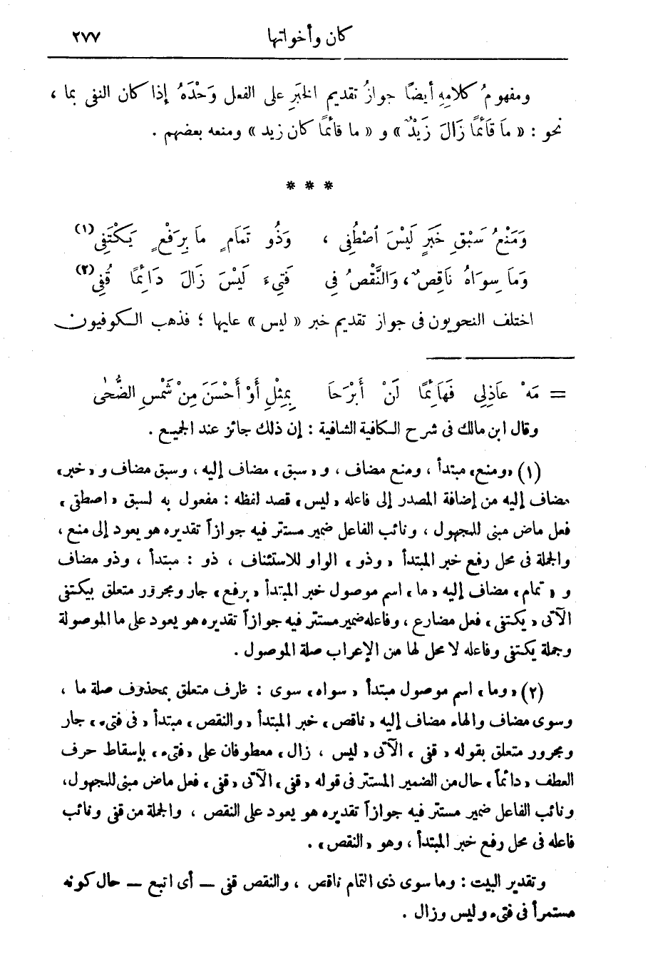 (2) " وما " اسم موصول مبتدأ " سواه " سوى: ظرف متعلق بمحذوف صلة ما، وسوى مضاف والهاء مضاف إليه " ناقص " خبر المبتدأ " والنقص " مبتدأ " في فتئ " جار ومجرور متعلق بقوله " قفى " الآتي " ليس، زال " معطوفان على " فتئ " بإسقاط حرف العطف " دائما " حال من الضمير المستتر في قوله " قفى " الآتي " قفى " فعل ماض مبني للمجهول، ونائب الفاعل ضمير مستتر فيه جوازا تقديره هو يعود على النقص، والجملة من قفى ونائب فاعله في محل رفع خبر المبتدأ، وهو " النقص ".