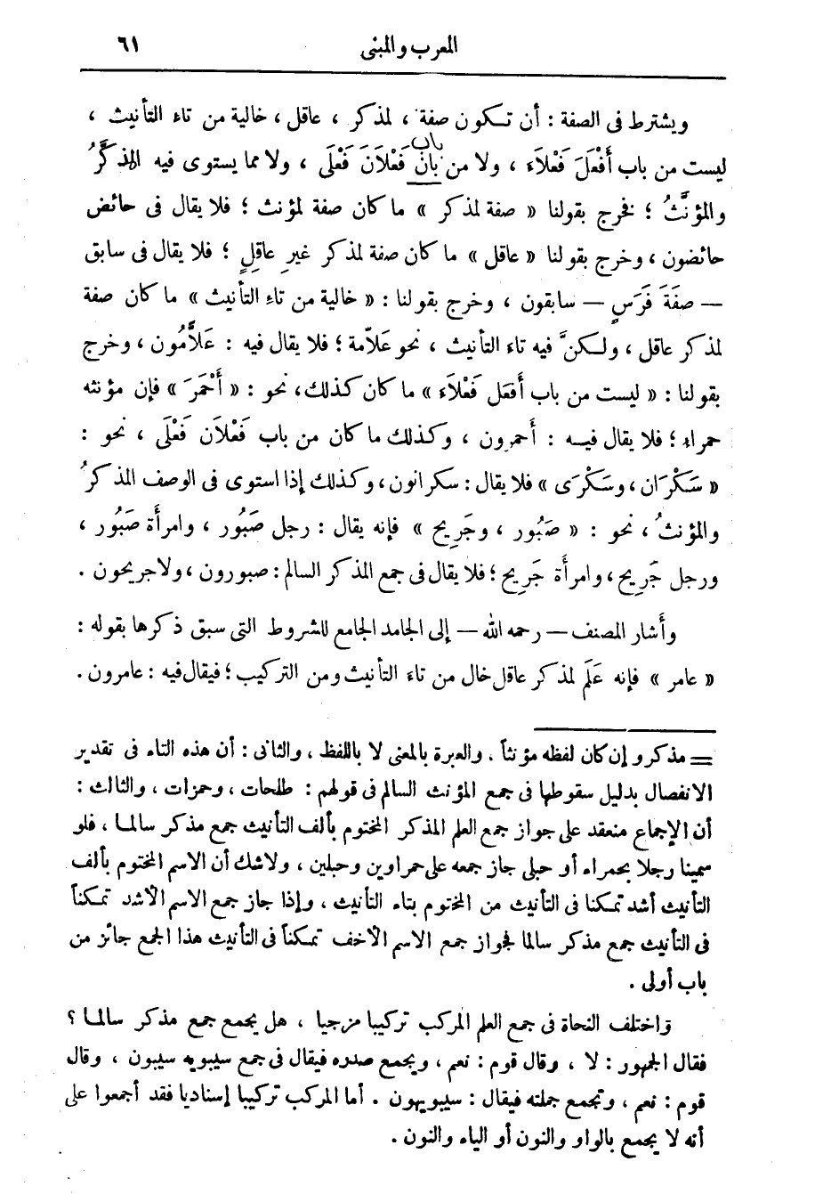 ويشترط في الصفة أن تكون صفة لمذكر عاقل خالية من تاء التأنيث ليست من باب أفعل فعلاء ولا من بان فعلان فعلى ولا مما يستوي فيه المذكر والمؤنث فخرج بقولنا صفة لمذكر ما كان صفة لمؤنث فلا يقال في حائض حائضون وخرج بقولنا عاقل ما كان صفة لمذكر غير عاقل فلا يقال في سابق صفة فرس سابقون وخرج بقولنا خالية من تاء التأنيث ما كان صفة لمذكر عاقل ولكن فيه تاء التأنيث نحو علامة فلا يقال فيه علامون وخرج بقولنا ليست من باب أفعل فعلاء ما كان كذلك نحو أحمر فإن مؤنثه حمراء فلا يقال فيه أحمرون وكذلك ما كان من باب فعلان فعلى نحو سكران وسكرى فلا يقال سكرانون وكذلك إذا استوى في الوصف المذكر والمؤنث نحو صبور وجريح فإنه يقال رجل صبور وامرأة صبور ورجل جريح وامرأة جريح فلا يقال في جمع المذكر السالم صبورون ولا جريحون وأشار المصنف رحمه الله إلى الجامد الجامع للشروط التي سبق ذكرها بقوله عامر فإنه علم لمذكر عاقل خال من تاء التأنيث ومن التركيب فيقال فيه عامرون.