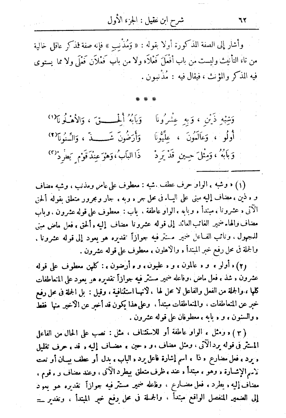 (1) " وشبه " الواو حرف عطف، شبه: معطوف على عامر ومذنب، وشبه مضاف و" ذين " مضاف إليه مبني على الياء في محل جر " وبه " جار ومجرور متعلق بقوله ألحق الآتي " عشرونا " مبتدأ " وبابه " الواو عاطفة، باب: معطوف على قوله عشرون، وباب مضاف والهاء ضمير الغائب العائد إلى قوله عشرونا مضاف إليه " ألحق " فعل ماض مبني للمجهول، ونائب الفاعل ضمير مستتر فيه جوازا تقديره هو يعود إلى قوله عشرونا، والجملة في محل رفع خبر المتبدأ " والاهلون " معطوف على قوله عشرون.