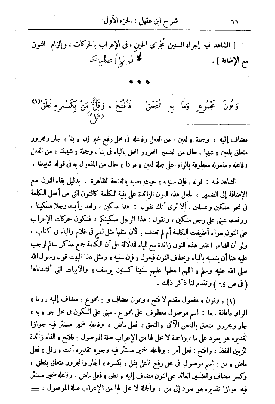 (1) " ونون " مفعول مقدم لا فتح، ونون مضاف و" مجموع " مضاف إليه " وما " الواو عاطفة، ما: اسم موصول معطوف على مجموع، مبني على السكون في محل جر " به " جار ومجرور متعلق بالتحق الآتي " التحق " فعل ماض، وفاعله ضمير مستتر فيه جوازا تقديره هو يعود على ما، والجملة لا محل لها من الاعراب صلة الموصول " فافتح " الفاء زائدة لتزيين اللفظ، وافتح: فعل أمر، وفاعله ضمير مستتر فيه وجوبا تقديره أنت " وقل " فعل ماض " من " اسم موصول في محل رفع فاعل بقل " بكسره " الجار والمجرور متعلق بنطق، وكسر مضاف والضمير العائد على النون مضاف إليه " نطق " فعل ماض، وفاعله ضمير مستتر فيه جوازا تقديره هو يعود ألى من، والجملة =
