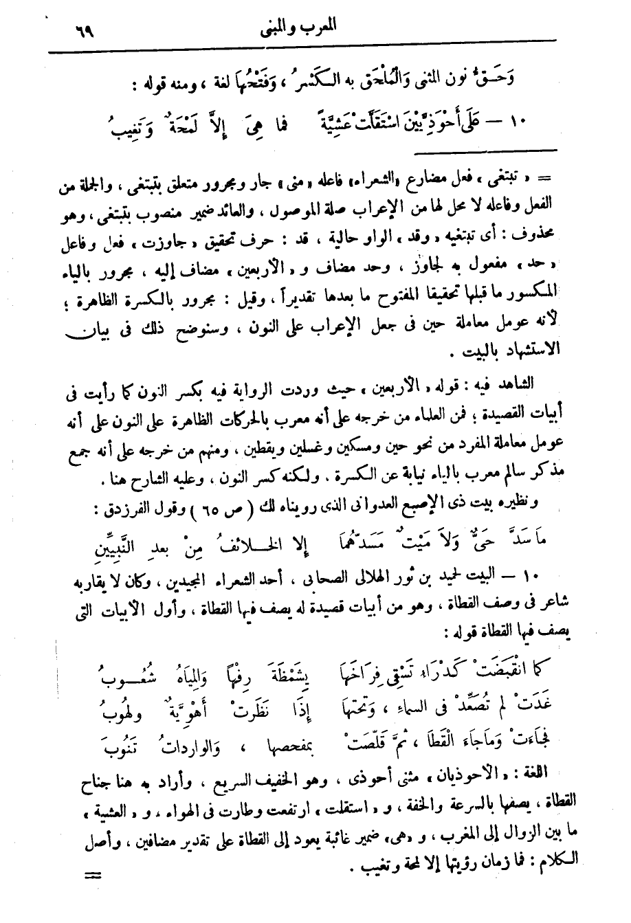 الشاهد فيه: قوله " الاربعين " حيث وردت الرواية فيه بكسر النون كما رأيت في أبيات القصيدة، فمن العلماء من خرجه على أنه معرب بالحركات الظاهرة على النون على أنه عومل معاملة المفرد من نحو حين ومسكين وغسلين ويقطين، ومنهم من خرجه على أنه جمع مذكر سالم معرب بالياء نيابة عن الكسرة، ولكنه كسر النون، وعليه الشارح هنا.