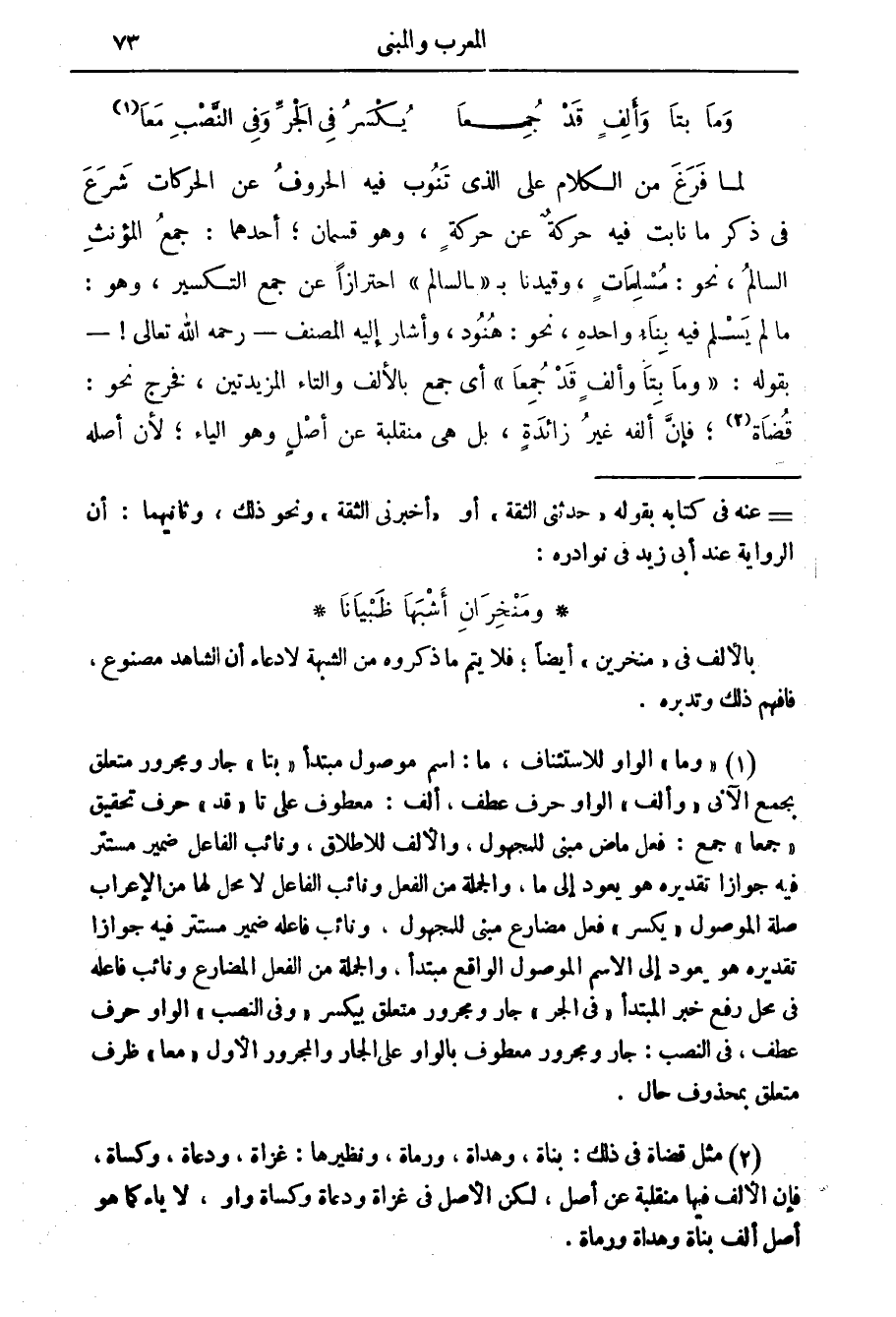 أحدهما: جمع المؤنث السالم نحو مسلمات وقيدنا ب السالم احترازا عن جمع التكسير وهو ما لم يسلم فيه بناء واحده نحو هنود وأشار إليه المصنف رحمه الله تعالى! بقوله: "وما بتا وألف قد جمعا أي جمع بالألف والتاء المزيدتين فخرج نحو قضاة (2) فإن ألفه غير زائدة بل هي منقلبة عن أصل