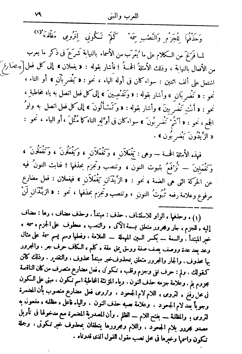 فهذه الأمثلة الخمسة وهي يفعلان وتفعلان ويفعلون وتفعلون وتفعلين ترفع بثبوت النون وتنصب وتجزم بحذفها فنابت النون فيه عن الحركة التي هي الضمة نحو الزيدان يفعلان فيفعلان فعل مضارع مرفوع وعلامة رفعه ثبوت النون وتنصب وتجزم بحذفها نحو: الزيدان