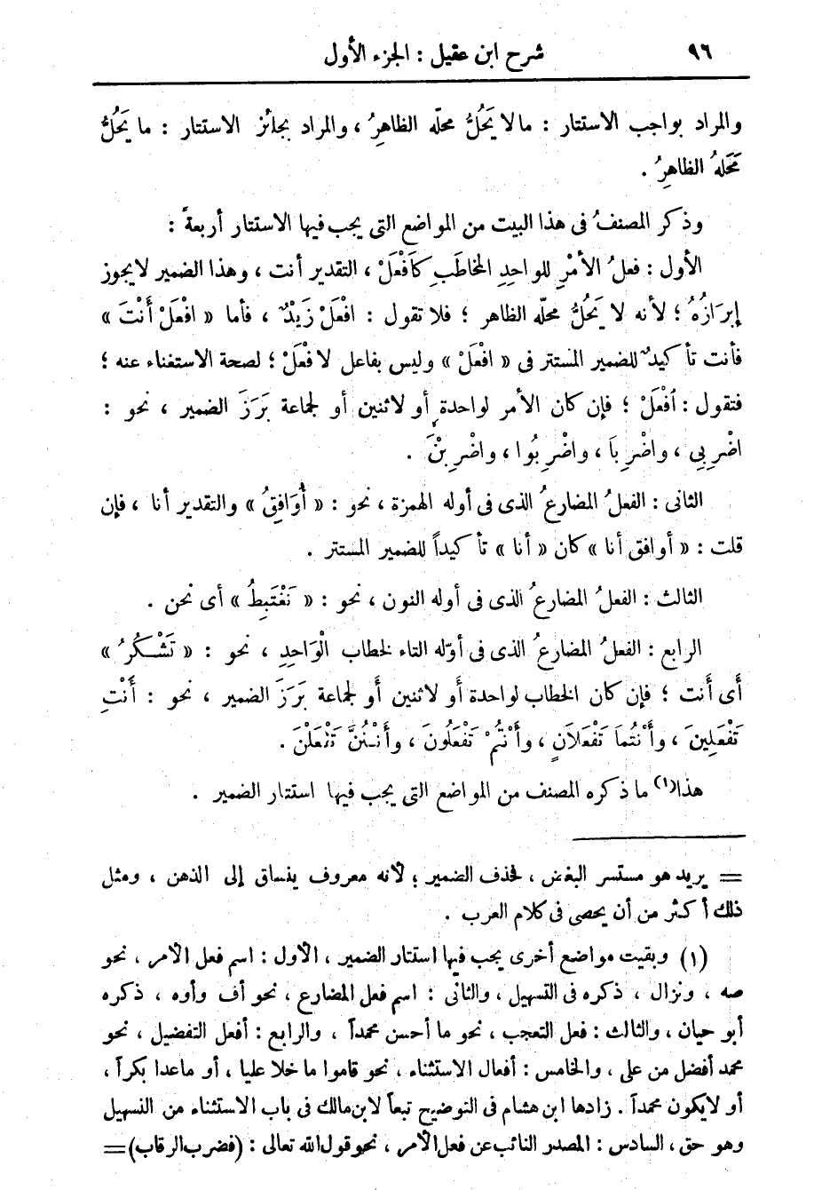 (1) وبقيت مواضع أخرى يجب فيها استتار الضمير، الاول: اسم فعل الامر، نحو صه، ونزال، ذكره في التسهيل، والثاني: اسم فعل المضارع، نحو أف وأوه، ذكره أبو حيان، والثالث: فعل التعجب، نحو ما أحسن محمدا، والرابع: أفعل التفضيل، نحو محمد أفضل من علي، والخامس: أفعال الاستثناء، نحو قاموا ماخلا عليا، أو ما عدا بكرا، أو لا يكون محمدا.