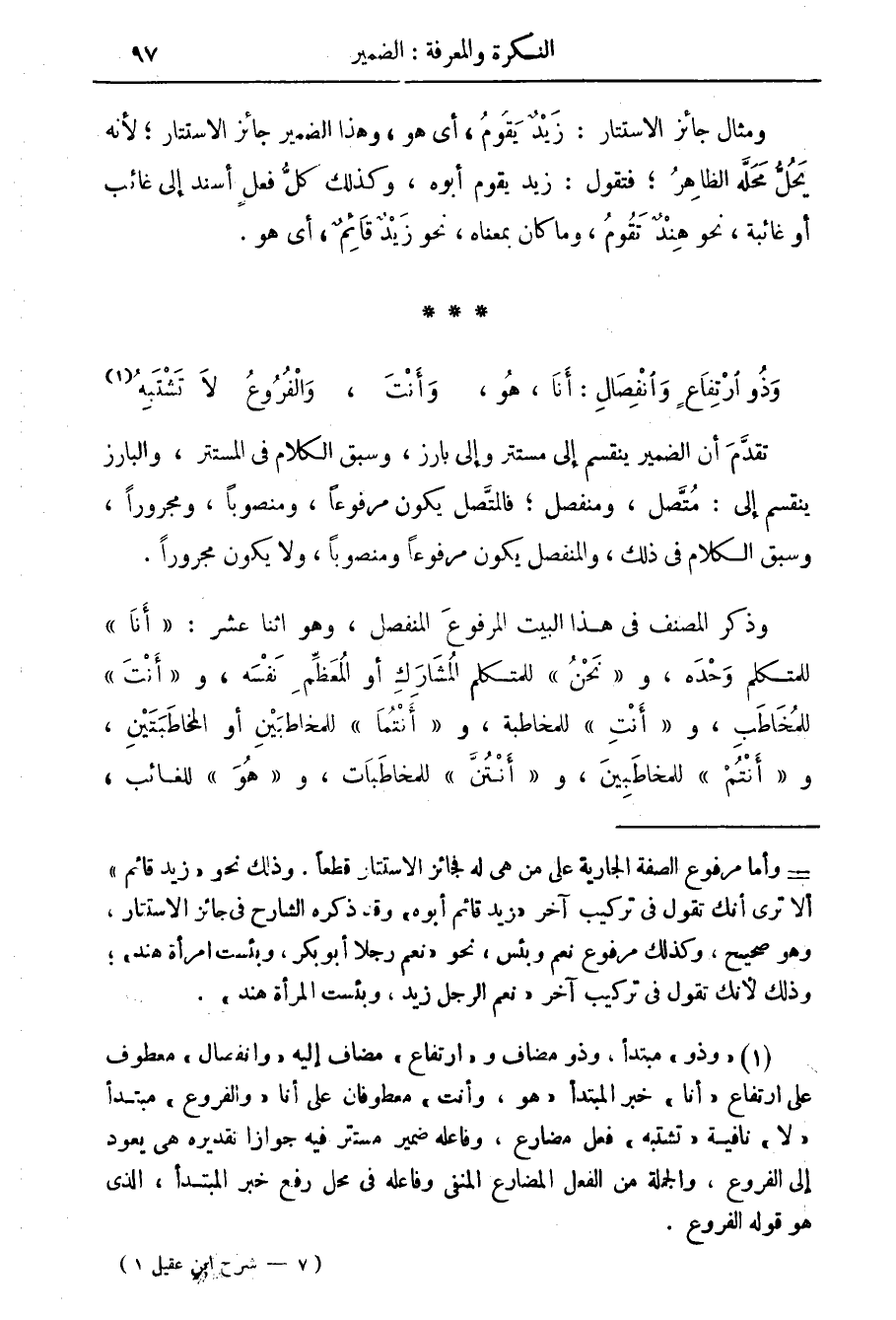 (1) " وذو " مبتدأ، وذو مضاف و" ارتفاع " مضاف إليه " وانفصال " معطوف على ارتفاع " أنا " خبر المبتدأ " هو، وأنت " معطوفان على أنا " والفروع " مبتدأ " لا " نافية " تشتبه " فعل مضارع، وفاعله ضمير مستتر فيه جوازا تقديره هي يعود إلى الفروع، والجملة من الفعل المضارع المنفي وفاعله في محل رفع خبر المبتدأ، الذي هو الفروع.