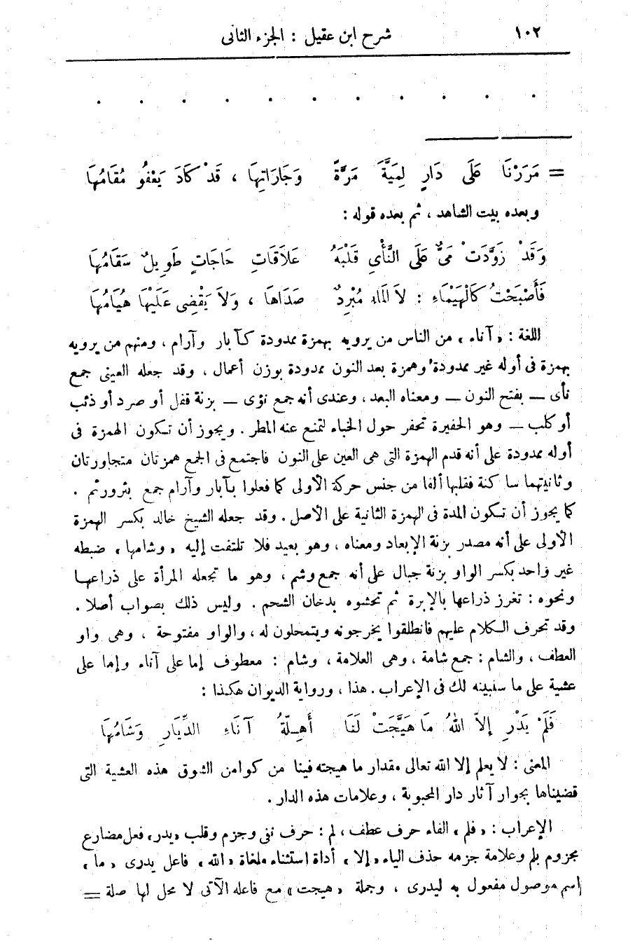 = مررنا على دار لمية مرة وجاراتها، قد كاد يعفو مقامها وبعده بيت الشاهد، ثم بعده قوله: وقد زودت مي على النأي قلبه علاقات حاجات طويل سقامها فأصبحت كالهيماء: لا الماء مبرد صداها، ولا يقضي عليها هيامها اللغة: " آناء " من الناس من يرويه بهمزة ممدودة كآبار وآرام، ومنهم من يرويه بهمزة في أوله غير ممدودة وهمزة بعد النون ممدودة بوزن أعمال، وقد جعله العيني جمع نأي - بفتح النون - ومعناه البعد، وعندي أنه جمع نؤي - بزنة قفل أو صرد أو ذئب أو كلب وهو الحفيرة تحفر حول الخباء لتمنع عنه المطر.