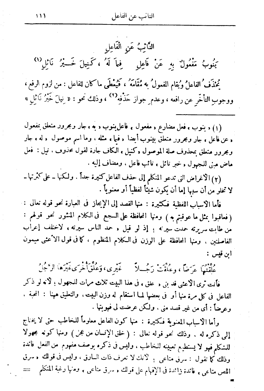 فأما الاسباب اللفظية فكثيرة: منها القصد إلى الايجاز في العبارة نحو قوله تعالى: (فعاقبوا بمثل ما عوقبتم به) ومنها المحافظة على السجع في الكلام المنثور نحو قولهم: من طابت سريرته حمدت سيرته، إذ لو قيل " حمد الناس سيرته " لاختلف إعراب الفاصلتين، ومنها المحافظة على الوزن في الكلام المنظوم، كما في قول الاعشى ميمون ابن قيس: علقتها عرضا، وعلقت رجلا غيري، وعلق أخرى غيرها الرجل فأنت ترى الاعشى قد بنى " علق " في هذا البيت ثلاث مرات للمجهول، لانه لو ذكر الفاعل في كل مرة منها أو في بعضها لما استقام له وزن البيت، والتعليق ههنا: المحبة، وعرضا: أي من غير قصد منى، ولكن عرضت لي فهويتها.