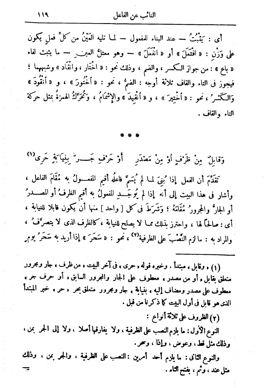 وأشار في هذا البيت إلى أنه إذا لم يوجد المفعول به أقيم الظرف أو المصدر أو الجار والمجرور مقامه وشرط في كل واحد منها أن يكون قابلا للنيابة أي صالحا لها واحترز بذلك مما لا يصلح للنيابة كالظرف الذي لا يتصرف والمراد به ما لزم النصب على الظرفية (2) نحو سحر إذا أريد
