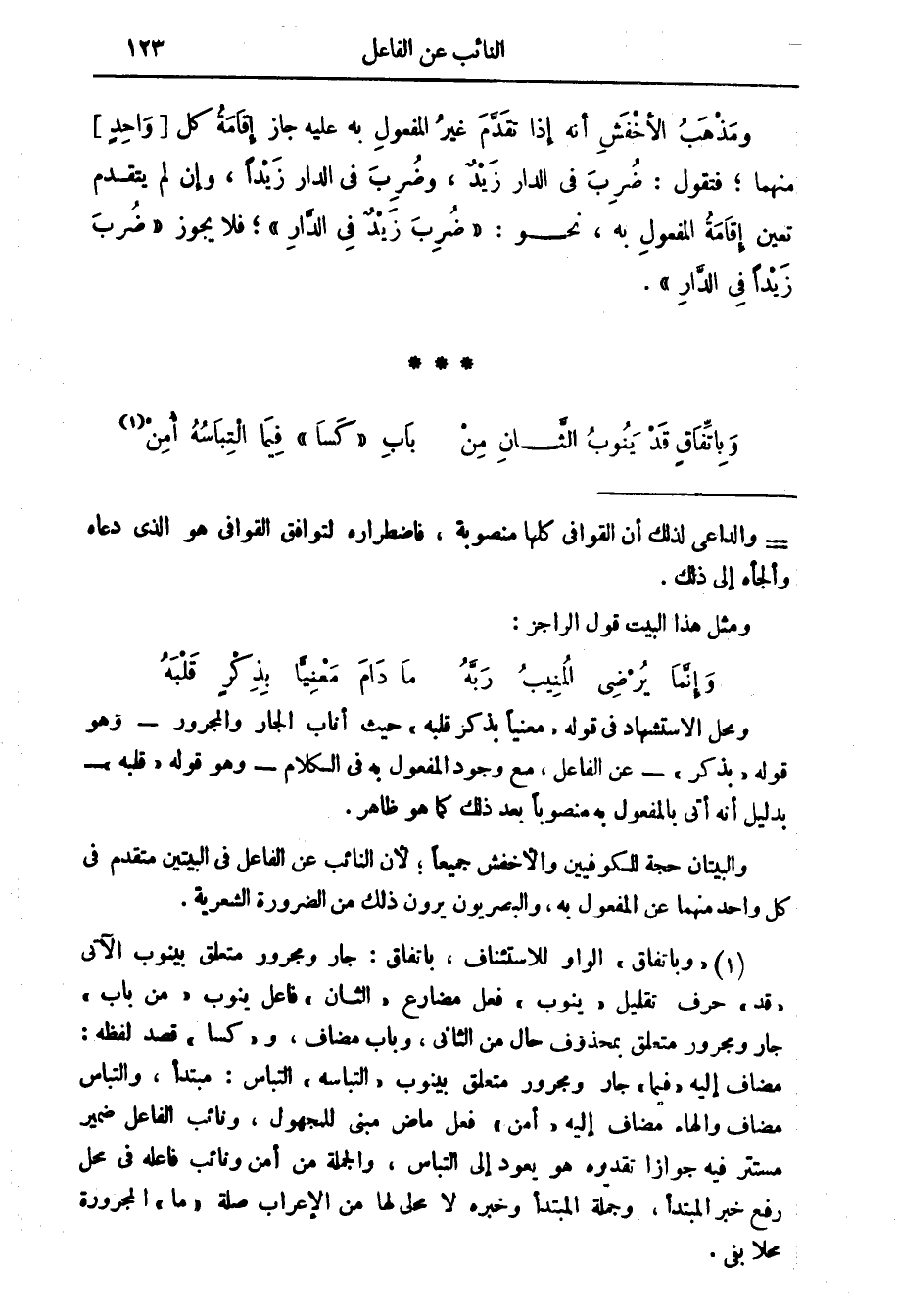 ومثل هذا البيت قول الراجز: وإنما يرضي المنيب ربه ما دام معنيا بذكر قلبه ومحل الاستشهاد في قوله " معنيا بذكر قلبه " حيث أناب الجار والمجرور - وهو قوله " بذكر " - عن الفاعل، مع وجود المفعول به في الكلام وهو قوله " قلبه " - بدليل أنه أتى بالمفعول به منصوبا بعد ذلك كما هو ظاهر.