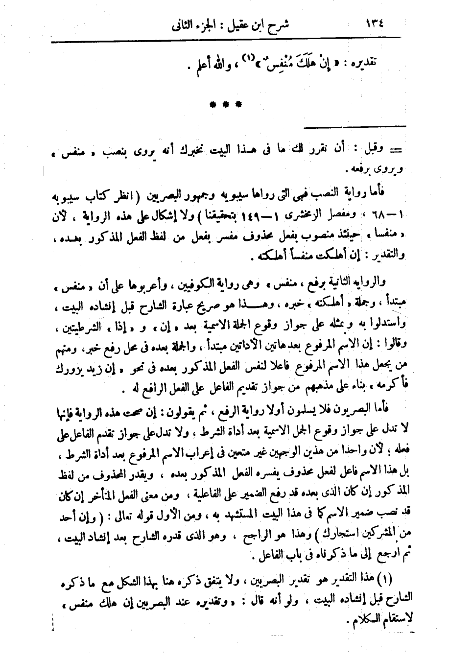 فأما رواية النصب فهي التي رواها سيبويه وجمهور البصريين (انظر كتاب سيبويه 1 - 68، ومفصل الزمخشري 1 - 149 بتحقيقنا) ولا إشكال على هذه الرواية، لان " منفسا " حينئذ منصوب بفعل محذوف مفسر بفعل من لفظ الفعل المذكور بعده، والتقدير: إن أهلكت منفسا أهلكته.