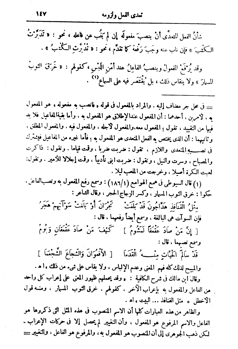 (1) قال السيوطي في همع الهوامع (1 / 186) : وسمع رفع المفعول به ونصب الفاعل، حكوا: خرق الثوب المسمار، وكسر الزجاج الحجر، وقال الشاعر: مثل القنافذ هداجون قد بلغت نجران أو بلغت سوآتهم هجر فإن السوآت هي البالغة، وسمع أيضا رفعهما، قال: [إن من صاد عقعقا لمشوم] كيف من صاد عقعقان وبوم وسمع نصبهما، قال: قد سالم الحيات منه القدما [الافعوان والشجاع الشجعما] والمبيح لذلك كله فهم المعنى وعدم الالباس، ولا يقاس على شئ من ذلك " اه وقال ابن مالك في شرح الكافية: " وقد يحملهم ظهور المعنى على إعراب كل واحد من الفاعل والمفعول به بإعراب الآخر، كقولهم: خرق الثوب المسمار، ومنه قول الاخطل مثل القنافذ.