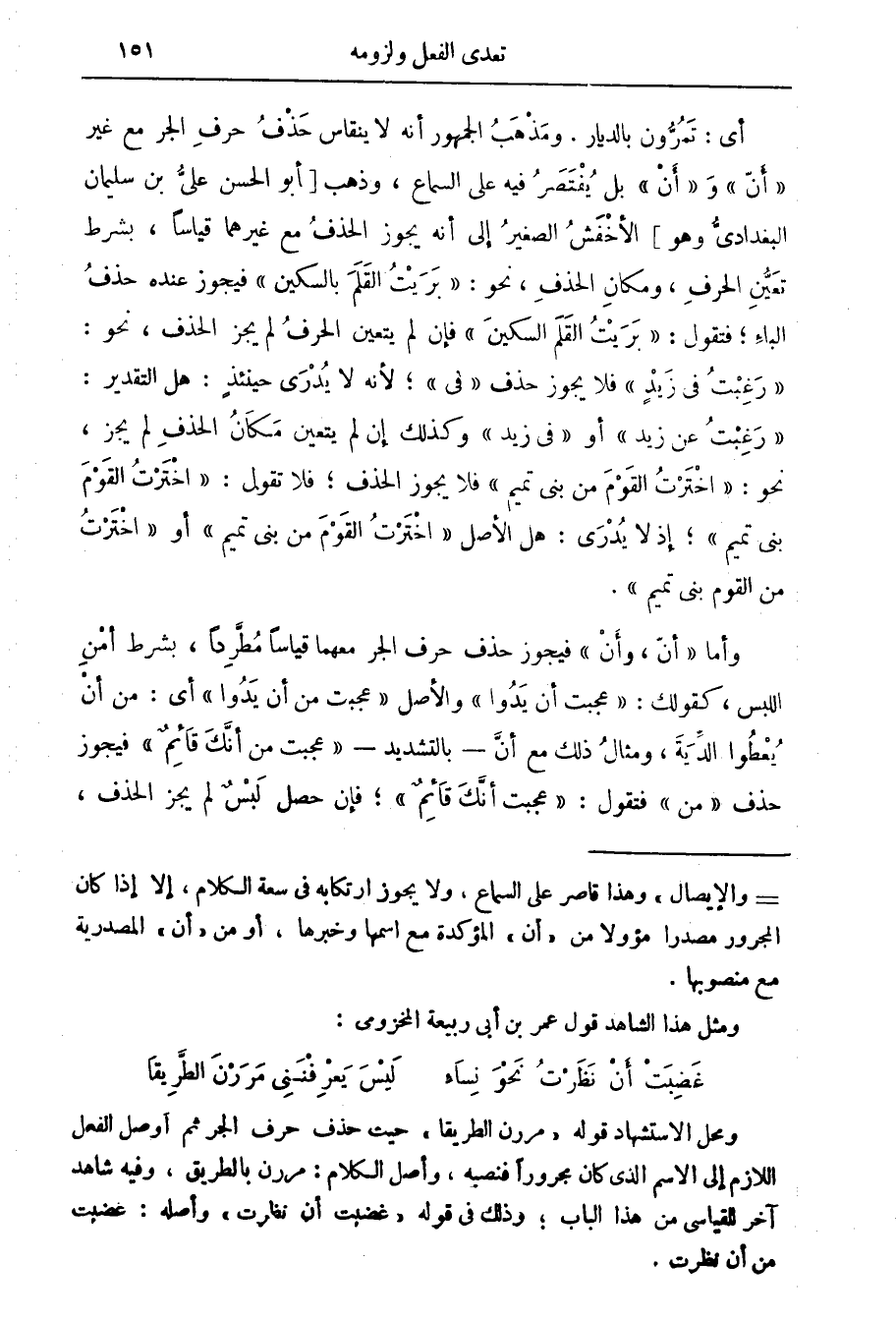 ومثل هذا الشاهد قول عمر بن أبي ربيعة المخزومي: غضبت أن نظرت نحو نساء ليس يعرفنني مررن الطريقا ومحل الاستشهاد قوله " مررن الطريقا " حيث حذف حرف الجر ثم أوصل الفعل اللازم إلى الاسم الذي كان مجرورا فنصبه، وأصل الكلام: مررن بالطريق، وفيه شاهد آخر للقياسي من هذا الباب، وذلك في قوله " غضبت أن نظرت " وأصله: غضبت من أن نظرت.